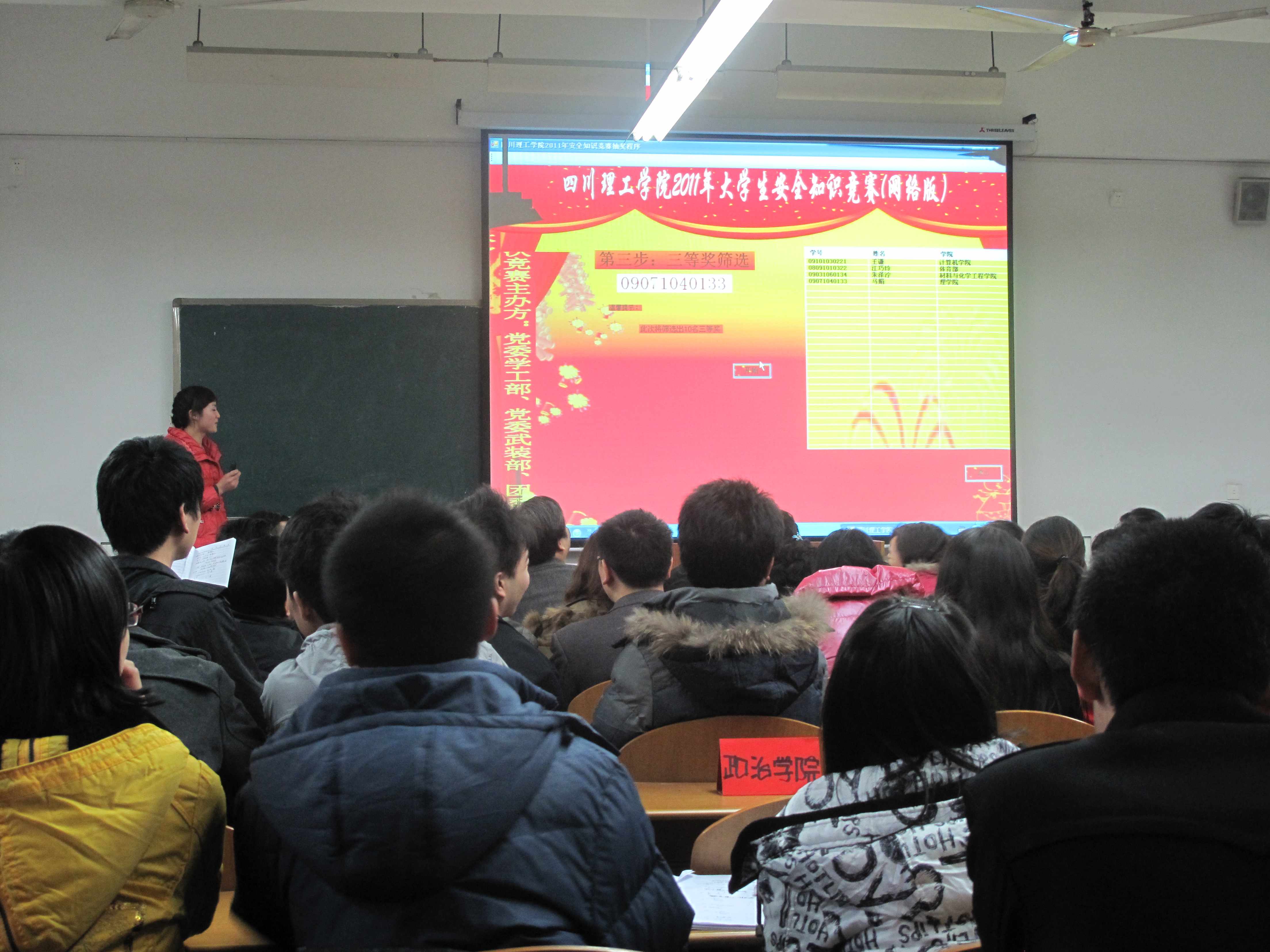 12月7日下午,学校第四届大学生安全知识竞赛(网络版)抽奖暨颁奖仪式在厚德楼431教室隆重举行。参赛同学和治保干部代表通过计算机随机抽取的方式分别抽取了一等奖2名、二等奖5名、三等奖10名以及优秀奖20名。通过现场抽奖,理学院数学与应用数学专业2009级1班陈钱涛、艺术学院音乐表演舞蹈专业2010级1班唐琛颖荣获一等奖,计算机学院网络工程2009级2班刘秋秀等5名同学荣获二等奖,体育部体育教育专业2008级3班江巧玲等10名同学荣获三等奖,经济与管理学院会计学专业2009级5班郭红艳等20名同学荣获优秀奖。会上学生处处长钱晓、保卫处处长钟世荣、团委副书记王建琼为获得优秀组织奖的法学院、材料与化学工程学院、化学与制药工程学院颁发了荣誉证书。