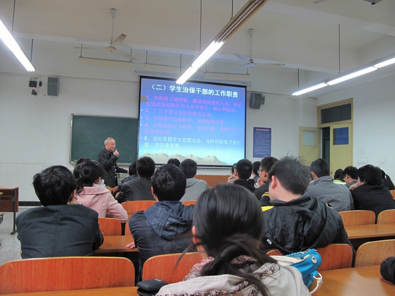 会上,李处长首先从学生治保干部培训的重要性和必要性、学生治保干部的主要工作、学院及周边环境、校园常见的安全问题及处理措施这几大方面进行了详细的讲解,他强调安全管理是学校管理工作的重要任务和内容,安全是师生人身财产安全的需要,并强调了治保干部的工作职责,同时李处长还对治保干部提出了新的要求,他希望干部要遵守国家法律,模范执行安全规章制度和安全操作规程,掌握基本安全知识和安全技能,有较强的责任心和良好的动机。不仅如此,他还结合校园生活实例给同学们讲述了一些安全问题,提醒同学们要防盗防骗,防意外伤害。
