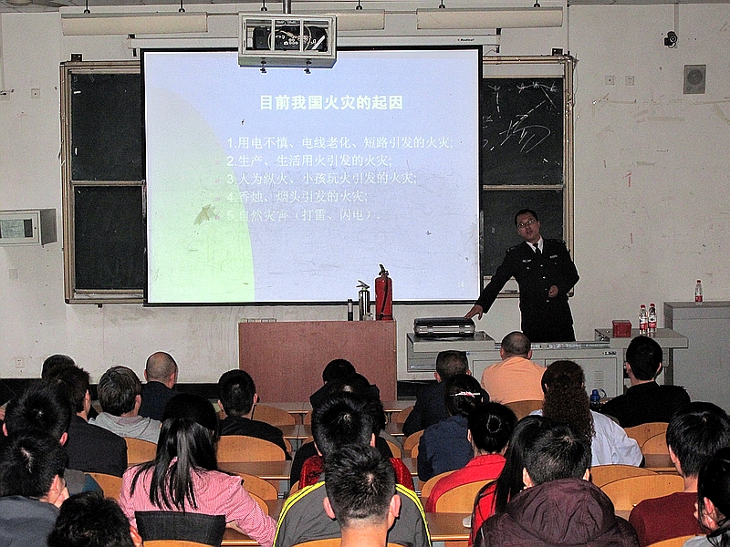 罗宏飞主要通过近年来发生在校园、家庭、汽车上的火灾案例,图文并茂、形象生动地讲解了火灾的种类,并向大家介绍了如何及时扑灭初起火灾,怎样正确疏散逃生,如何正确使用灭火器具,以及使用大功率电器容易引发火灾的原因等消防知识。