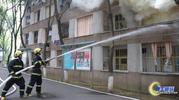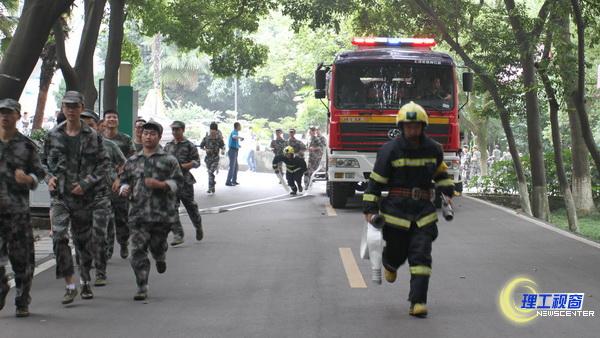 14:30分,滚滚浓烟从4栋2楼一间学生宿舍涌出,警铃拉响,演练开始!学生们开始从各个宿舍楼的安全通道有序撤出并在教官带领下跑向预设集合地点。几乎在同一时刻,早已等待在学校外的消防车开进校园,消防员打开水枪,向着“着火”的寝室喷水,14:35分,带着消毒面具的消防员到达“着火点”,扑灭火源。整个演练过程安全、有序,无踩踏、受伤事件。