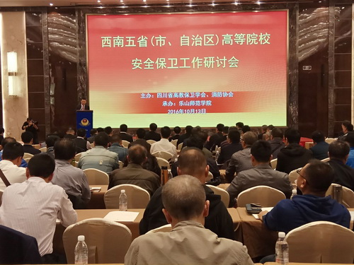 10月12日至14日,西南五省(市、自治区)高等院校安全保卫工作研讨会在乐山市隆重举行。本次研讨会由四川省高教保卫学会、消防协会主办,乐山师范学院承办,来自西南地区80所高校200余名安全工作管理干部参加研讨会。我校保卫处副处长李成学、王再评一行5人参加。会议由中国高教保卫学会副理事长、四川高教保卫学会秘书长、四川大学保卫处处长袁斌主持。
