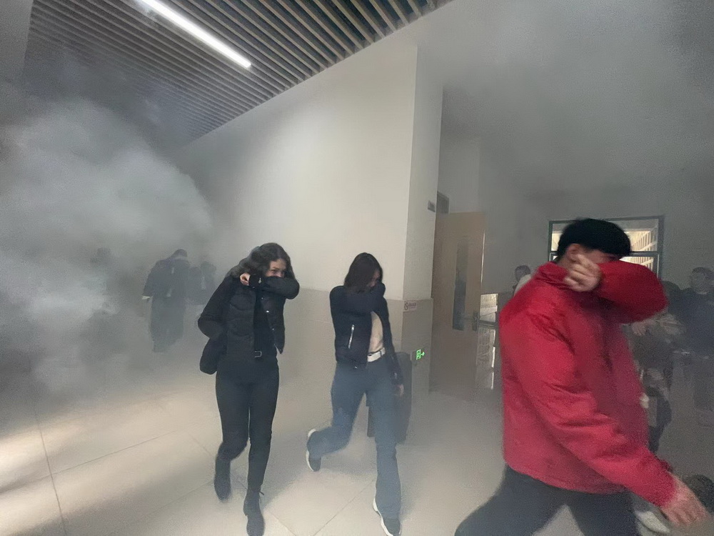 在急促的警报声中开始了消防应急疏散演练,随着烟雾弹的释放,全体留学生按疏散演练流程,用湿毛巾捂住口鼻,弯腰低头,快速通过了烟雾区域,迅速而有序地按照预定路线进行疏散。在整个演练过程中,短短几分钟内,全部学生安全有序撤离。