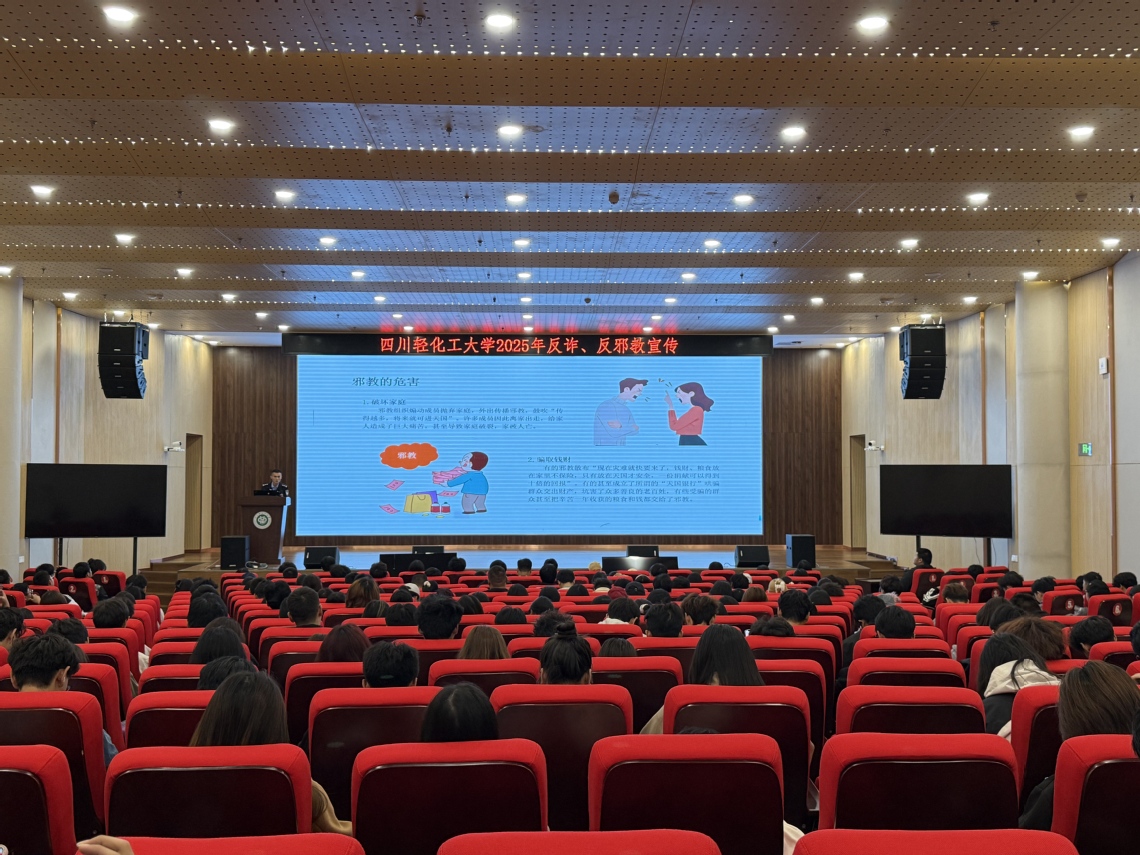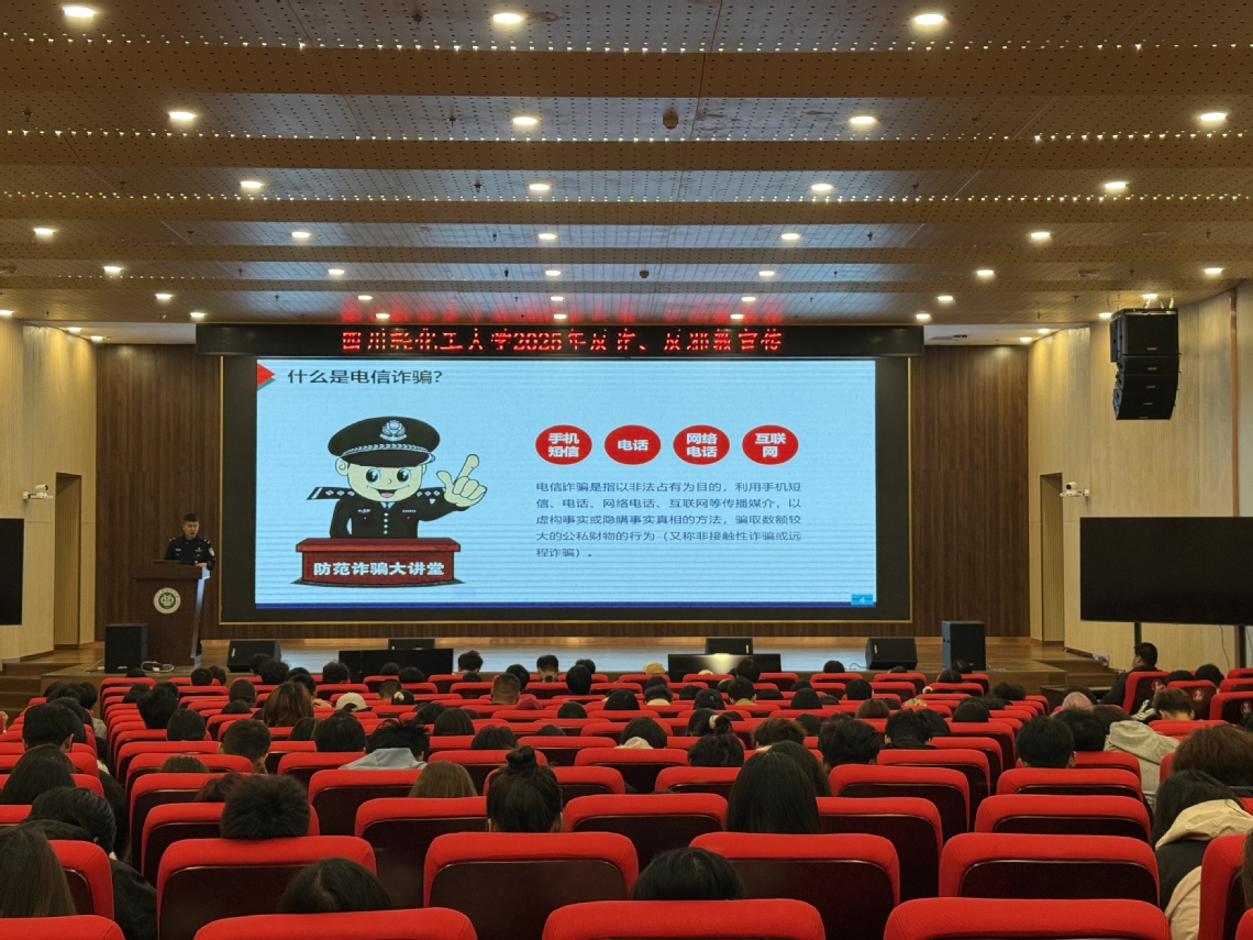 为持续深化平安校园建设,全面提升学生防范诈骗、抵制邪教的安全意识。10月22日下午,党委保卫部特邀自贡市公安局大安分局政保大队副大队长刘扬、反诈中心民警刘盛聪在李白河校区学术报告厅举办反邪教、反诈骗专题教育宣传讲座。