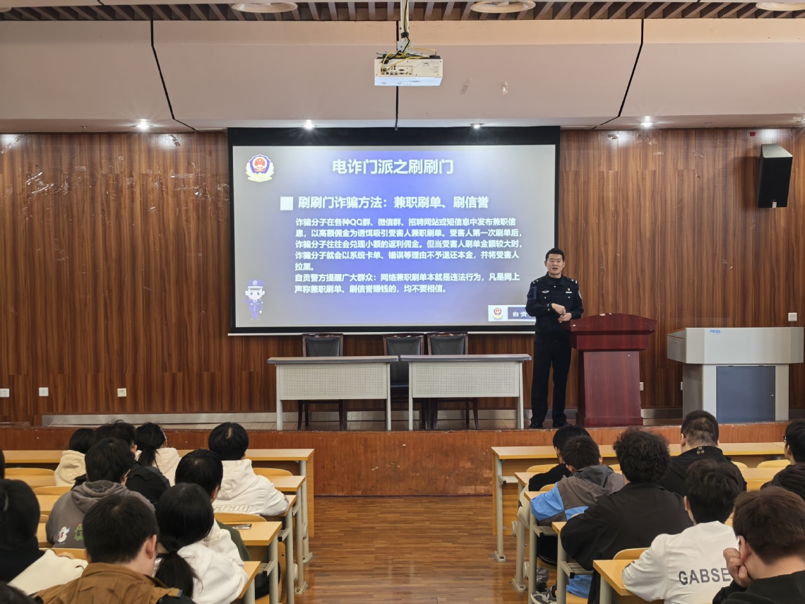 为切实提升同学们的反诈防骗意识和自我保护能力,11月5日下午,党委保卫部邀请自贡市高新区公安局学苑街派出所民警肖腾龙在汇东校区第四实验楼214室开展反诈骗专题教育宣传讲座。