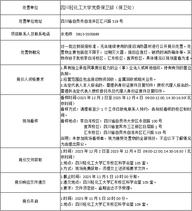 四川轻化工大学2025年废旧消防器材处置竞价出售的公告