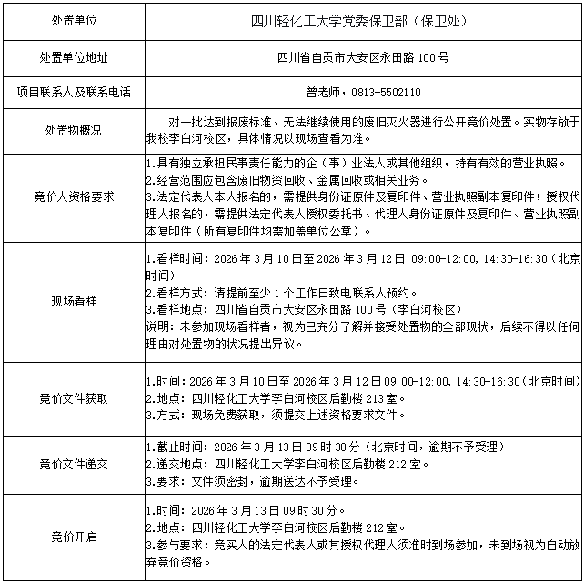 四川轻化工大学2026年废旧灭火器公开竞价处置的公告