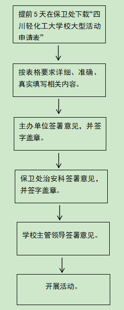 (一)活动开展前5天在保卫处主页下载“四川轻化工大学大型活动申请表”,按要求详细、准确、真实填写相关内容,同时递交要求材料。