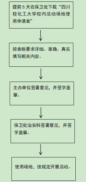 (一)活动开展前5天在保卫处主页下载“四川轻化工大学校园活动场地使用申请表”,按要求详细、准确、真实填写相关内容。