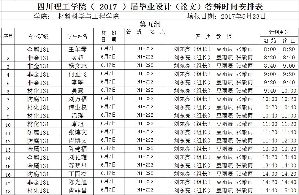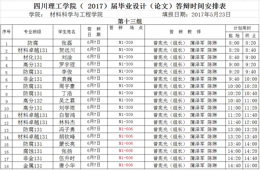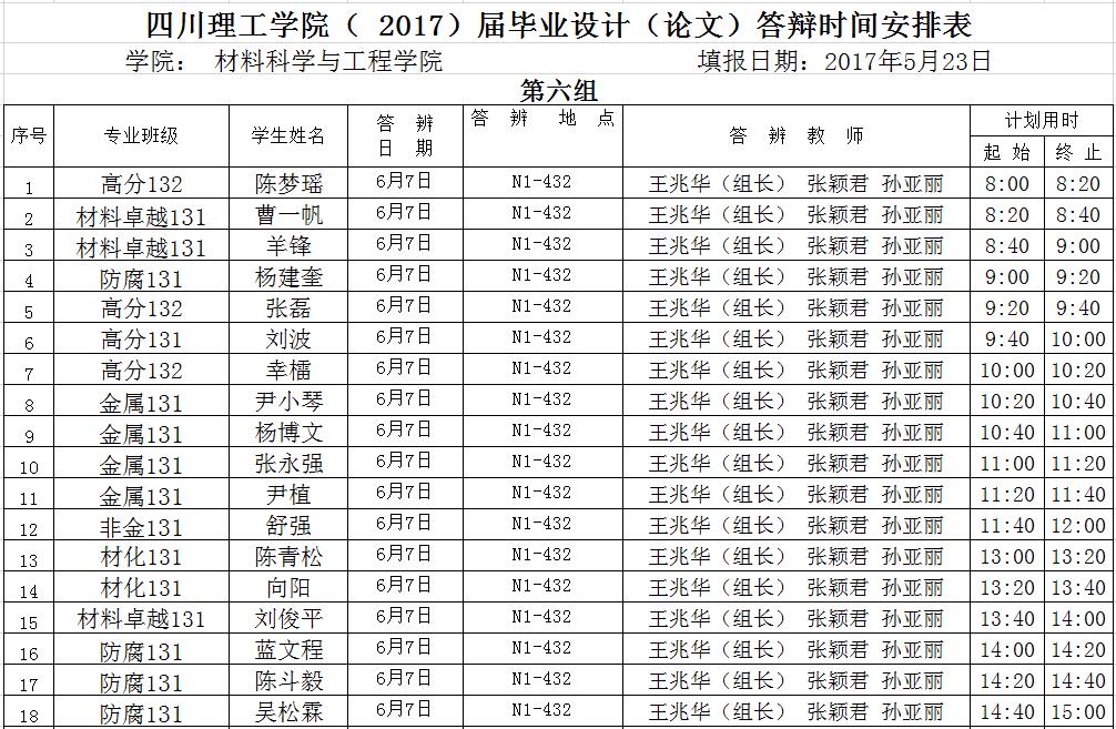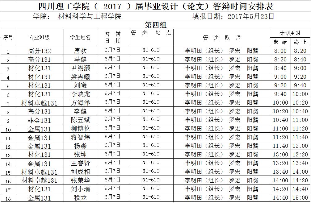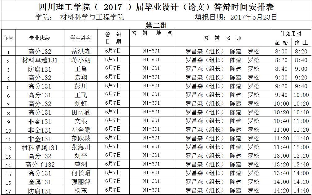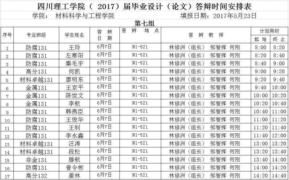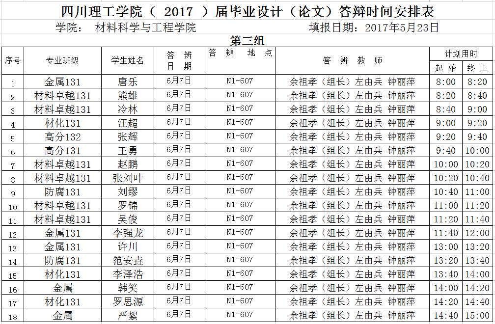 材料学院2017届毕业答辩安排(一辩)