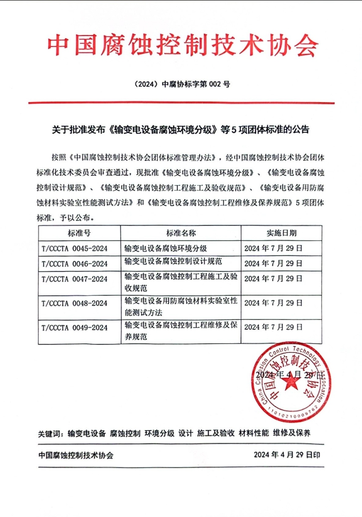 近日,由四川轻化工大学、中国南方电网有限责任公司超高压输电公司柳州局、沈阳中科腐蚀控制工程技术有限公司、华北电力科学研究院有限责任公司等8家企业、高校和行业协会为主要起草单位,我院李新跃教授、窦宝捷博士作为主要起草人,中国腐蚀控制技术协会发布的《输变电设备用防腐蚀材料实验室性能测试方法》(T/CCCTA 0048—2024)团体标准在全国标准信息公共服务平台正式发布,将于2024年7月29日实施。标准规定了输变电设备用防腐蚀材料的实验室性能测试项目及测试方法、测试结果评定、实验报告的要求。适用于输变电设备用防腐蚀材料实验室性能测试及评价。