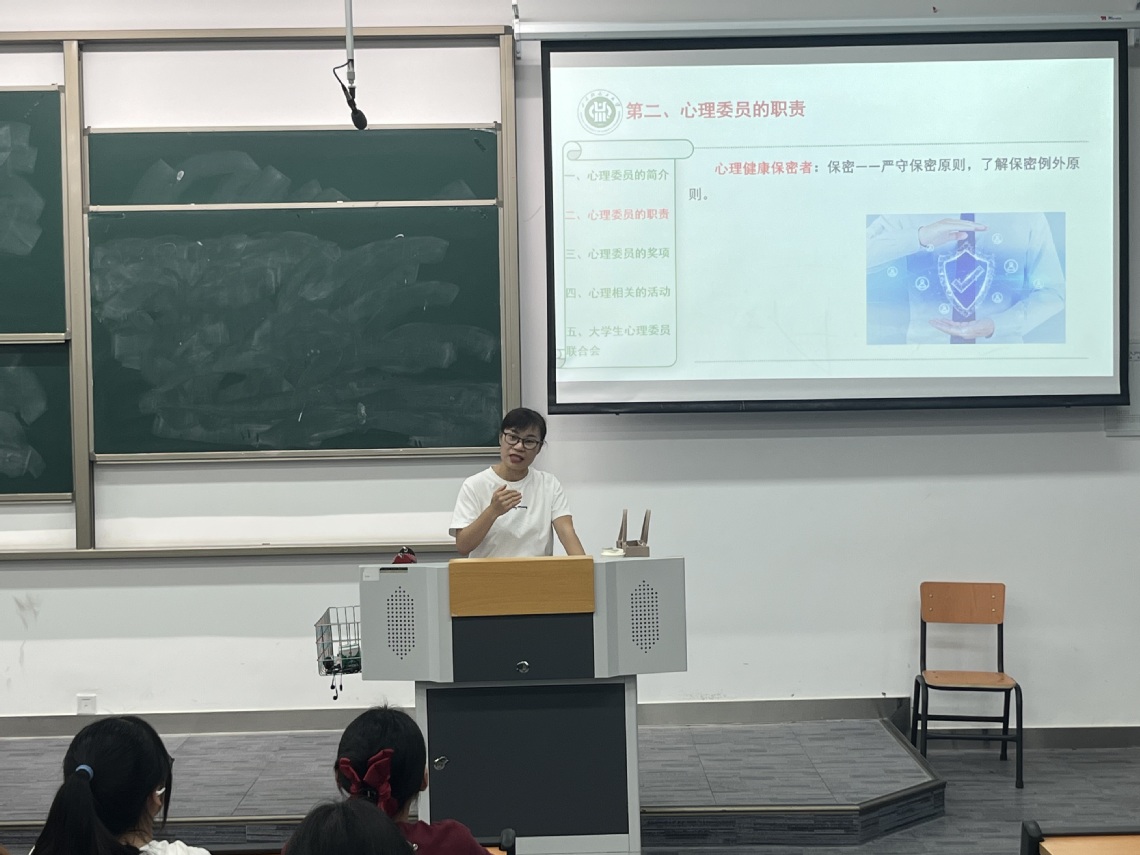 培训会上,杨俊老师首先对心理委员的职责进行了详细介绍。她指出,心理委员作为班级中专门负责心理素质教育工作的班委成员,肩负着多重重要职责。他们是心理知识宣传者,负责宣传心理卫生知识、传播心理健康理念,让同学们了解学校心理工作和心理援助渠道,并指导同学如何向专业人员求助。他们也是心理诉求倾听者,在同学遇到困扰时,给予倾听、理解、支持与安慰。同时,大家也是心理工作的参与者和组织者,要配合学校相关部门预防和干预学生心理危机事件,并组织开展相应的团体心理辅导、活动和主题班会等。此外,心理委员还需要具备判断心理问题的能力,能简单判断同学是否有心理障碍的风险及严重程度,在遇到威胁生命安全的情况时,立刻寻求专业人员的帮助。同时还要做好心理健康保密工作,严守保密原则。