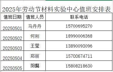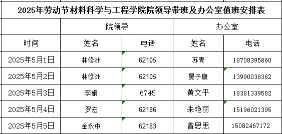 2025年劳动节院领导带班及办公室、材料实验中心值班安排表