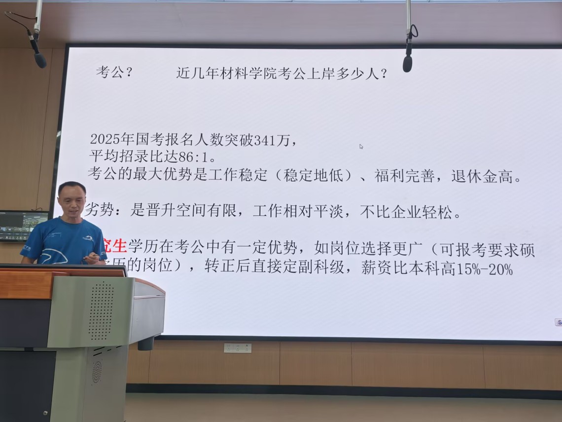 高分子教研室主任曾盛渠分享了当前的考研和就业总体形式,指出"无论选择何种发展路径,都需要持之以恒的努力与清晰的自我认知"。材料学院副书记李娟对分享会进行总结,指出此类经验传承对学风建设与生涯规划的重要意义。