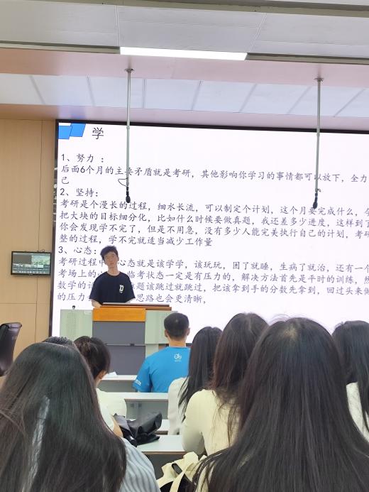 任瑞阳(四川大学)、邹洋(西南交通大学)分别从数学、专业课、英语和政治四门学科分享了备考策略。例如,强调数学需“跟住一位老师系统学习”,并推荐通过真题训练查漏补缺;注重知识点的串联与应用。