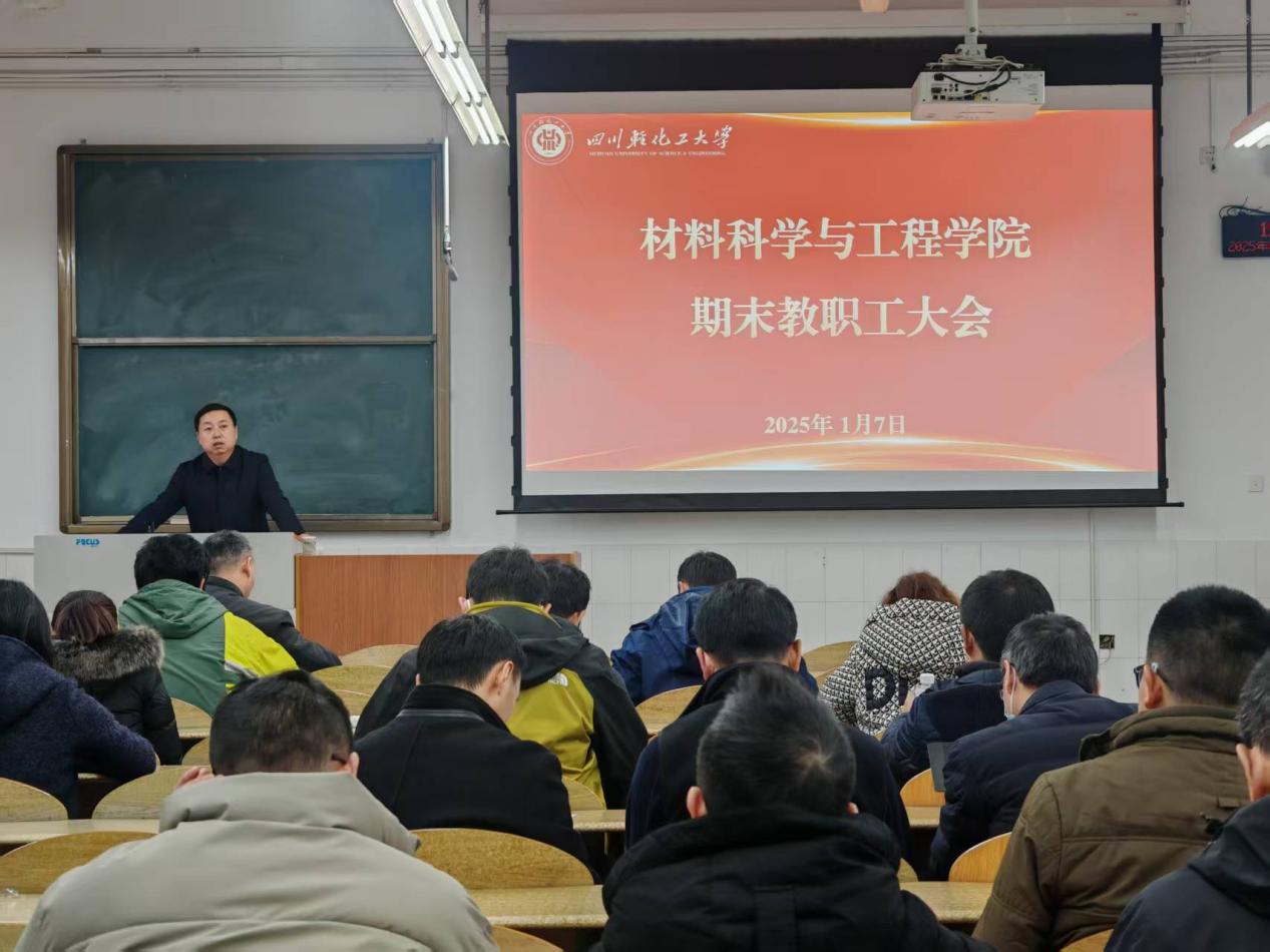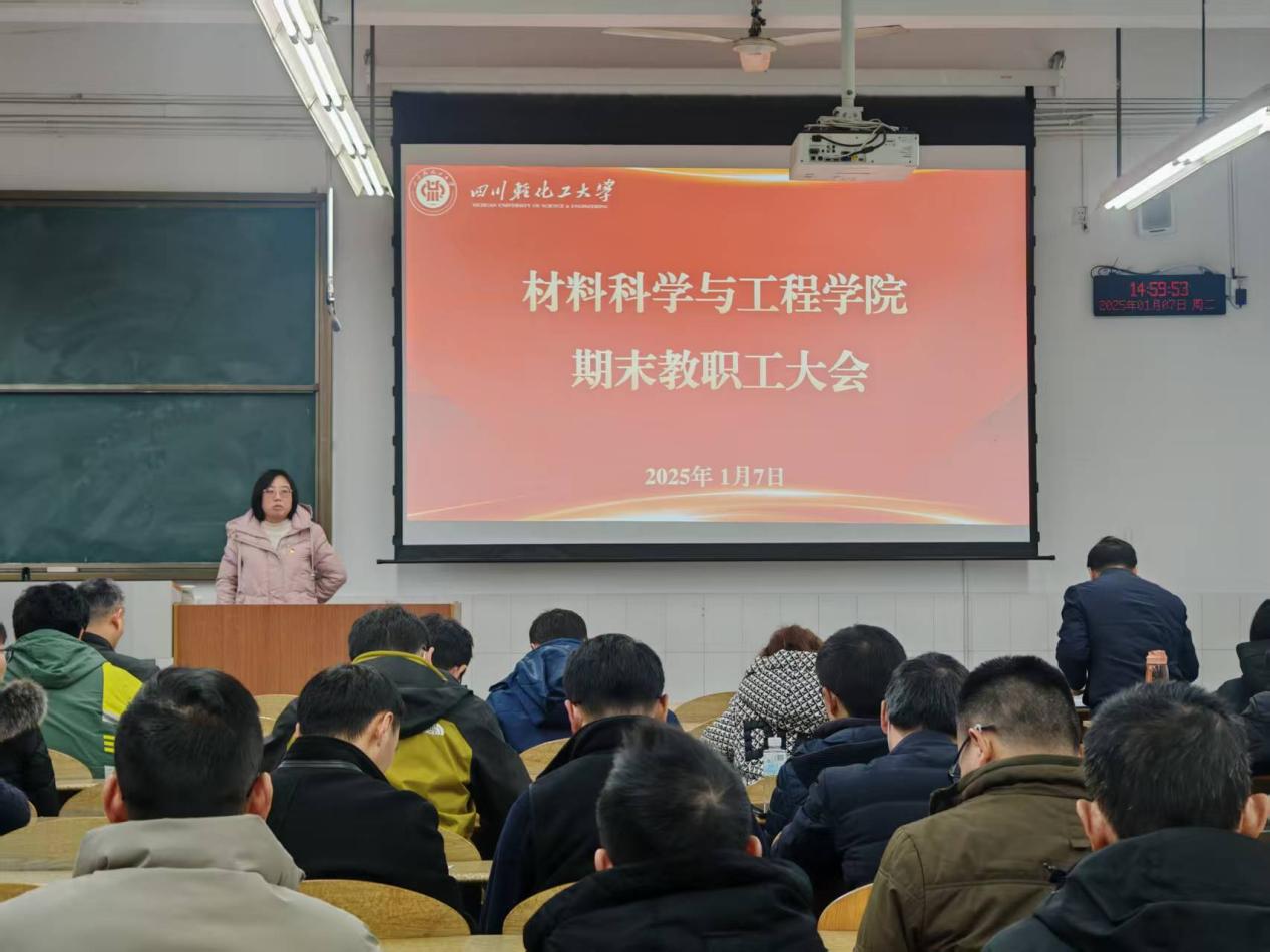 1月7日,材料科学与工程学院在汇东校区厚德楼122教室召开教职工大会。会议由党委副书记李娟主持,院长金永中,副院长林修洲、罗宏出席,全院教职工参加。此次会议全面总结2024年各项工作,明确2025年工作方向,为学院发展凝聚共识、汇聚力量。