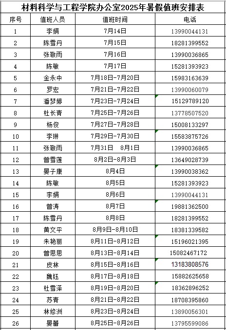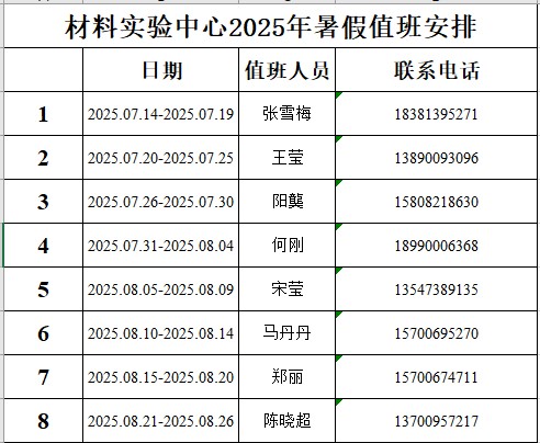 材料科学与工程学院办公室和材料实验中心2025年暑假值班安排表