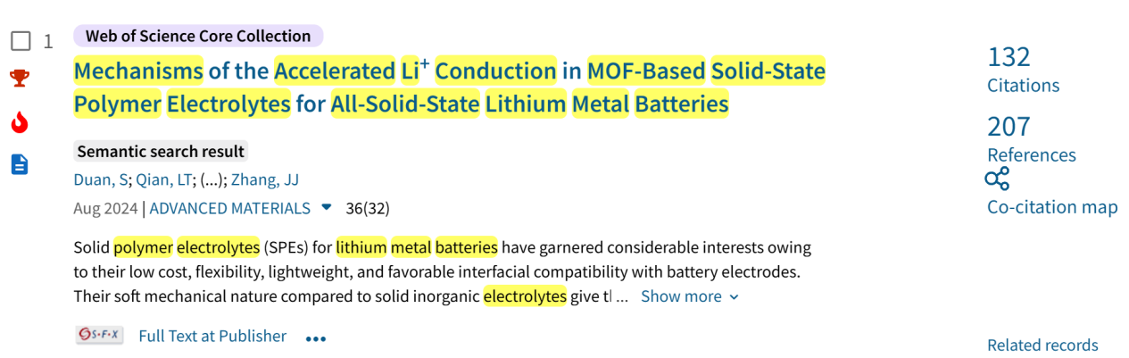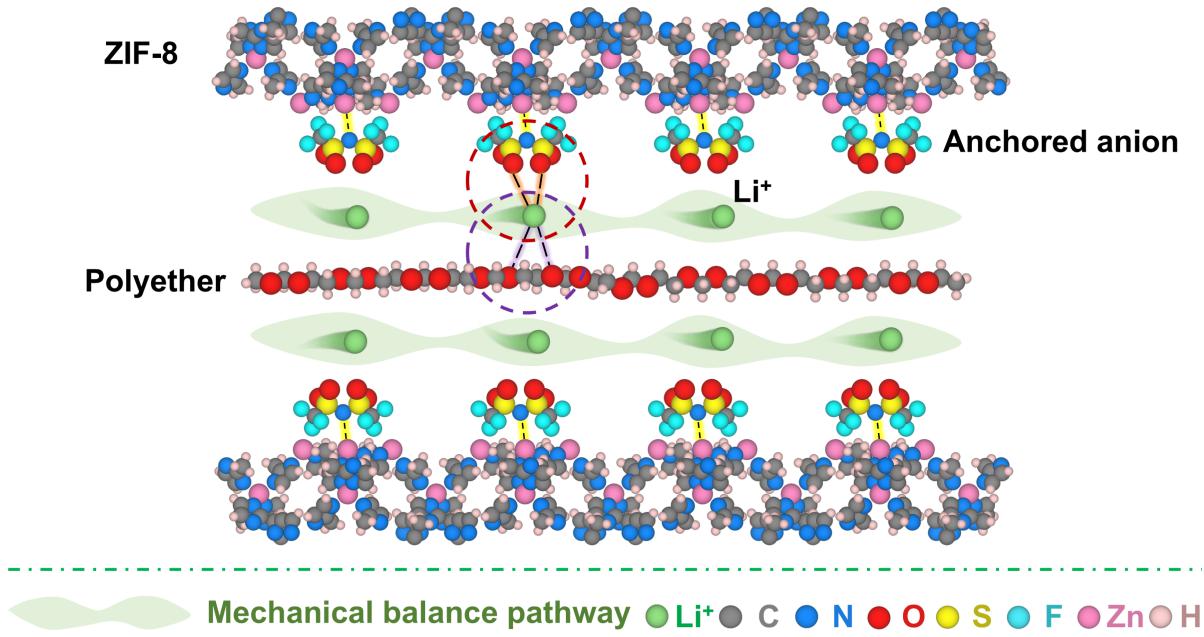 聚合物电解质因其易于加工和优越的电极界面相容性而被广泛应用于锂金属电池,但由于强Li+聚合物相互作用和曲折的离子传输途径,其离子电导率本质上较低。受物理学中“力学平衡(MB)”原理的启发,段松校友提出了一种创新策略,包括构建一个MB区,在这个MB区中,通过MOF锚定的阴离子簇对Li+的作用力来平衡Li+聚合物的强相互作用,使Li+在聚合物电解质中形成极弱的配位态,并且进一步通过结构设计将这些MB区连接,实现了电解质中Li+的短距离、近乎无摩擦的快速传输。