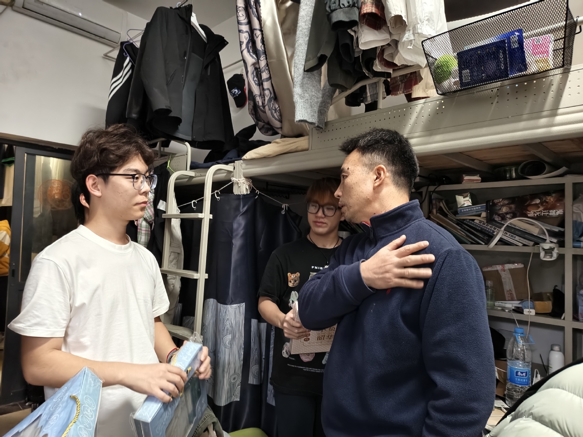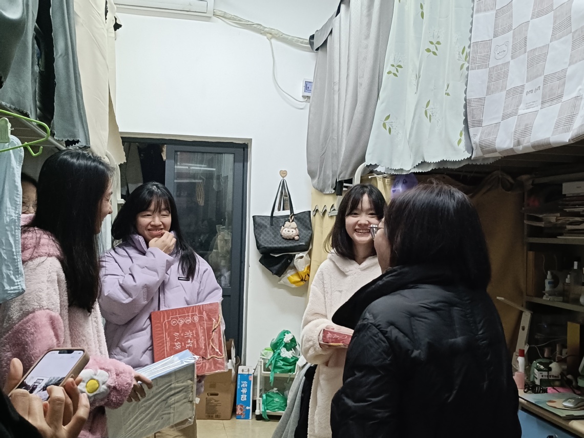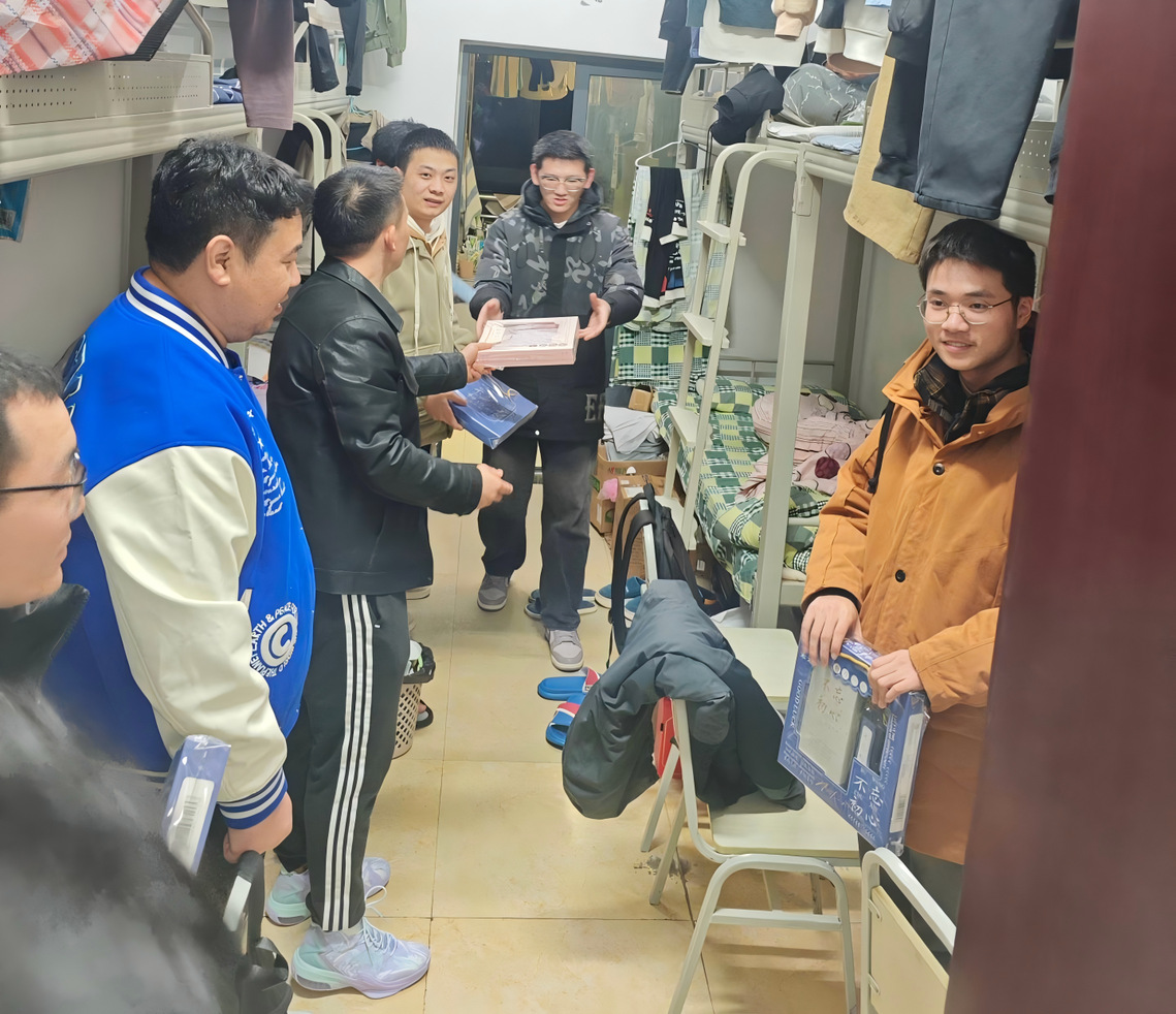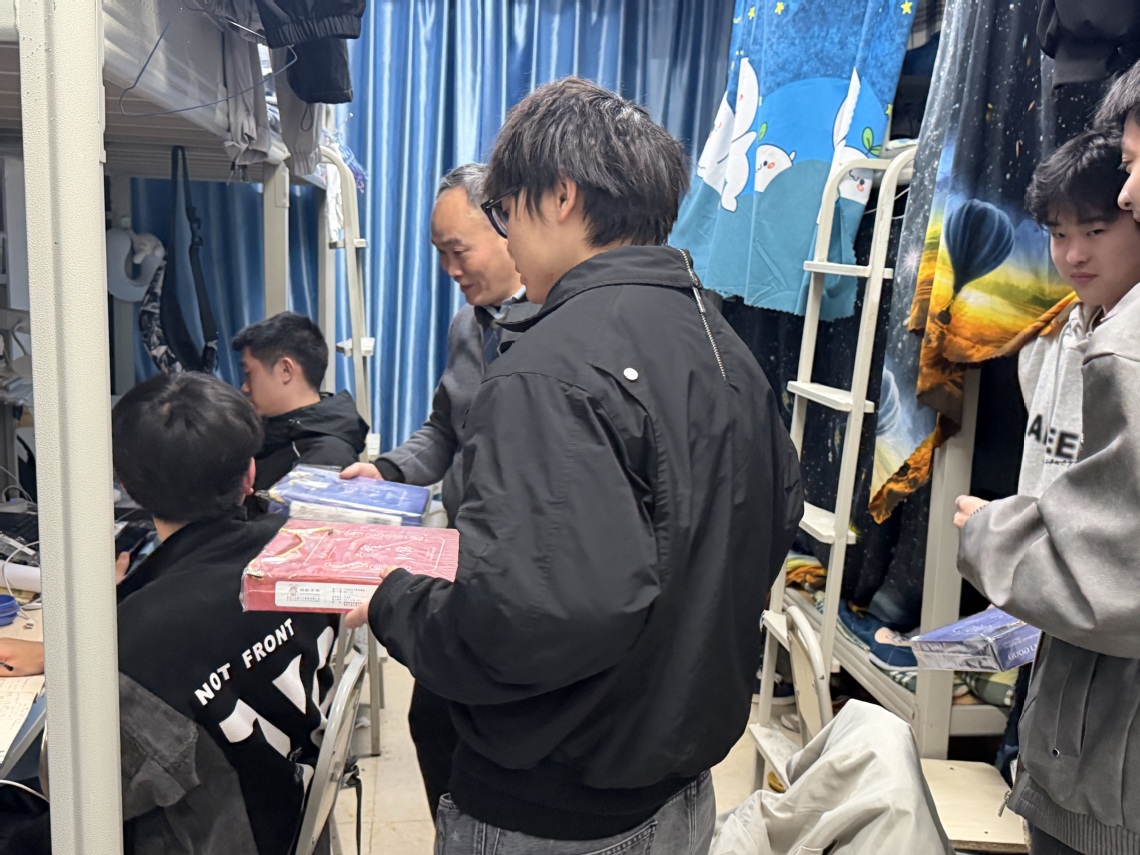在走访过程中,学院领导与辅导员们亲切询问同学们的复习进展和生活状况,对他们持之以恒的奋斗精神给予高度赞扬。“最近复习状态怎么样?”“一定要注意劳逸结合,保持良好心态。”一句句暖心问候回荡在宿舍中。老师们特别叮嘱同学们在最后冲刺阶段要科学安排时间,注意防寒保暖,并送上精心准备的慰问品。这些满载心意的礼物不仅体现了学院对学生的深切关怀,更传递了全体师生对考研学子的美好祝愿。同学们纷纷表示,学院送来的不仅是物资上的支持,更是精神上的鼓舞,让他们在紧张的备考阶段感受到了浓厚的关怀与支持。