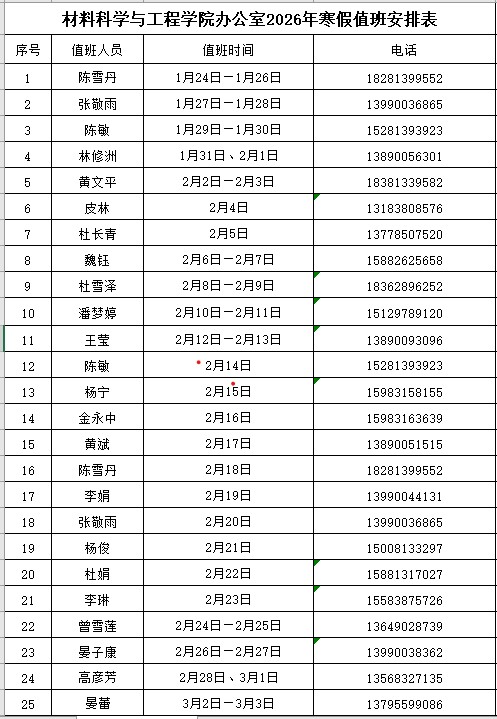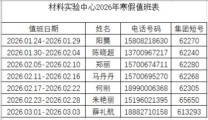 材料科学与工程学院办公室和材料实验中心2026年寒假值班安排表