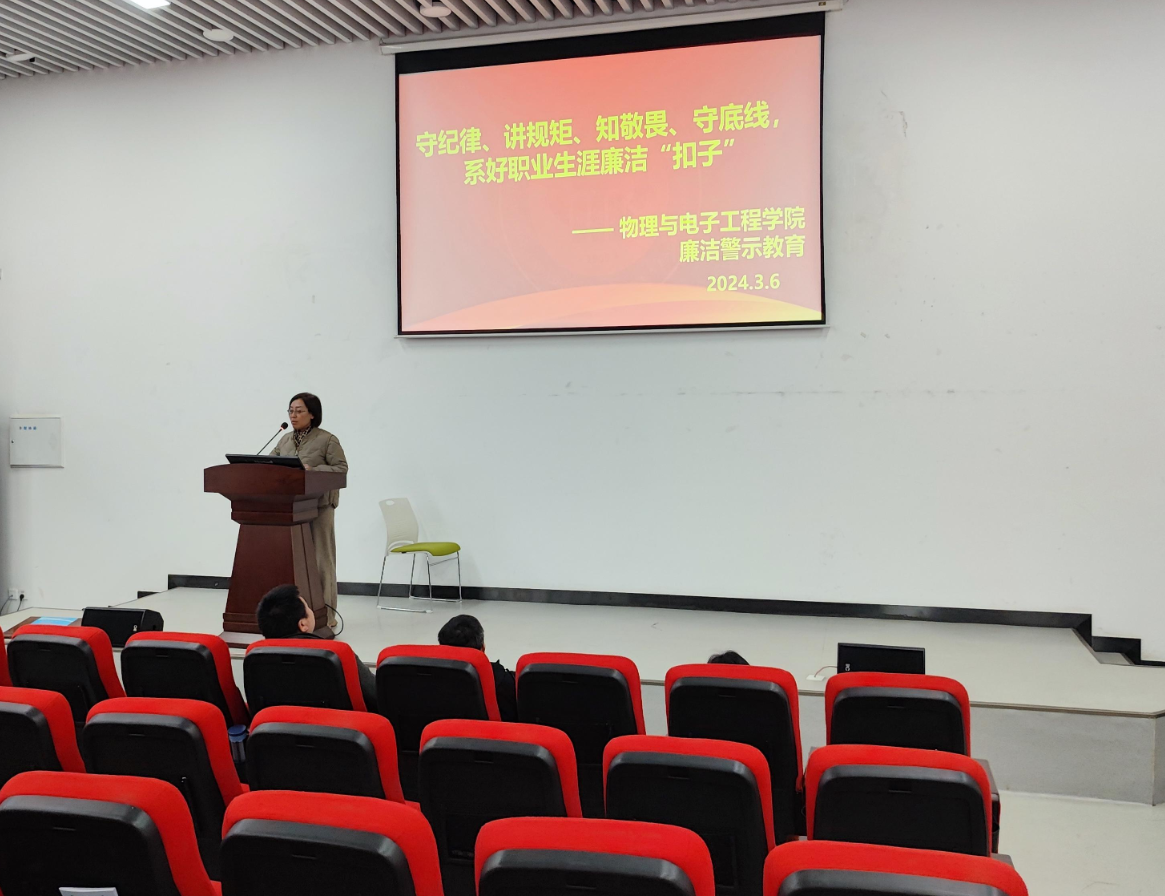 为持续做好学院党风廉政建设工作,进一步强化教职工纪法观念和廉洁从教意识;3月6日,物理与电子工程学院在宜宾校区召开2024年廉洁警示教育大会。会议由学院党委书记钟世友主持,全体教职工参加会议。