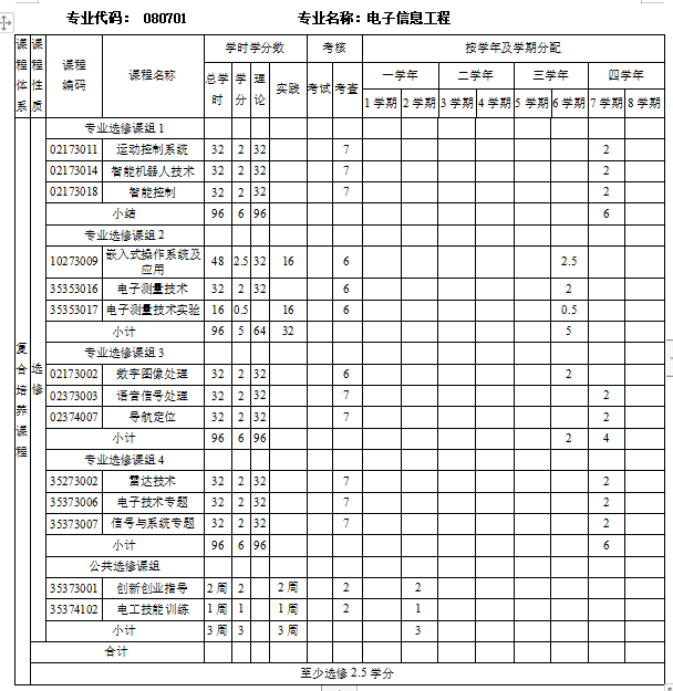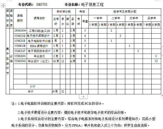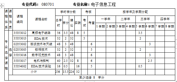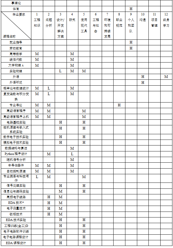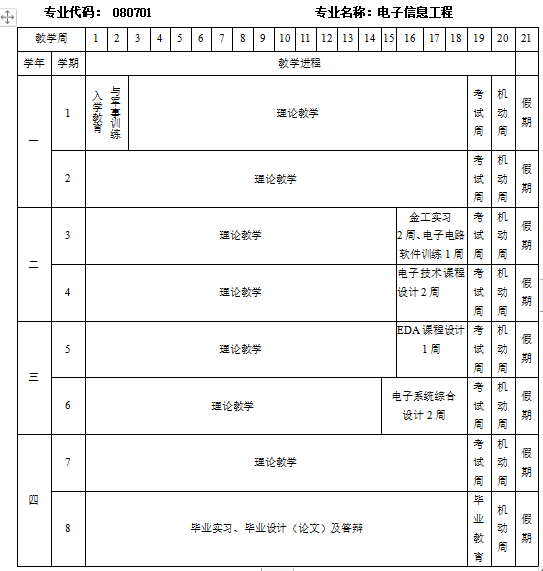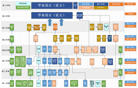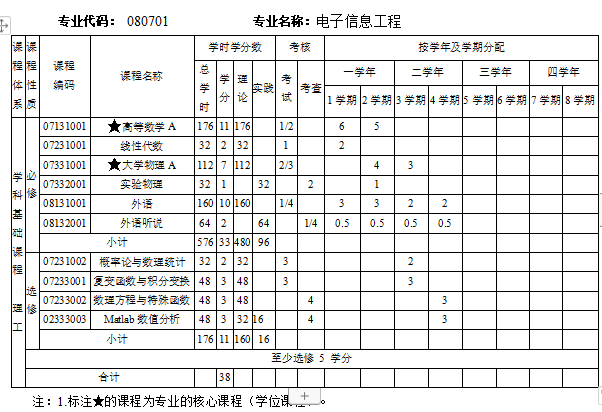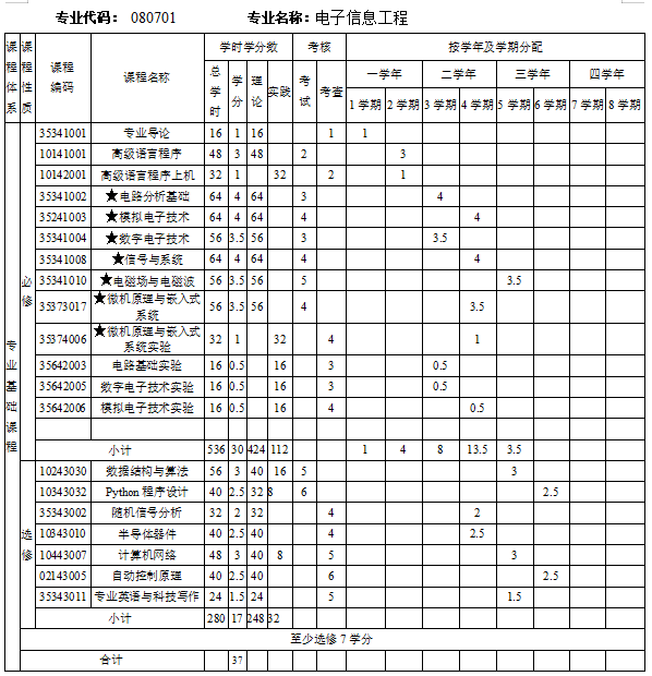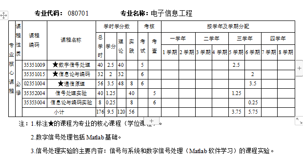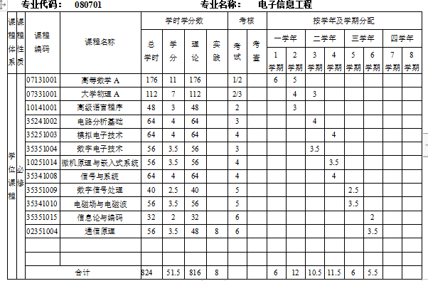 主要课程:高等数学、大学物理、高级语言程序、电路分析基础、模拟电子技术、数字电子技术、信号与系统、电磁场与电磁波、高频电子线路、数字信号处理、信息论与编码、通信原理、数据结构与算法、微机原理及应用、EDA技术等。