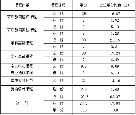 符合学校学籍管理有关规定,完成本专业培养方案规定的全部课程与其他教学环节,修满本专业规定的最低总学分(156分),其中,素质教育课程39学分,学科基础课程38学分,专业基础课程37学分,专业核心课程9.5学分,专业选修课程8学分,集中实践环节22学分,复合培养课程2.5学分,准予毕业,获得大学本科学历;符合学校学位授予条例规定条件者,可获得学士学位。
