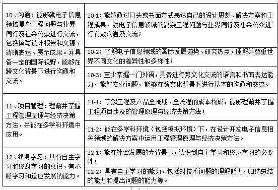 10、沟通:能够就电子信息领域复杂工程问题与业界同行及社会公众进行交流,包括撰写设计报告和文稿、清晰表达、展示成果。并具备一定的国际视野,能够在跨文化背景下进行沟通和交流。