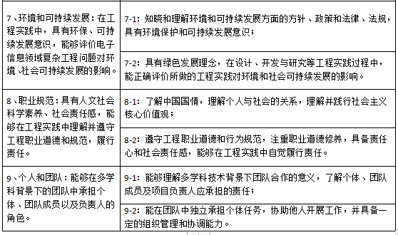 7、环境和可持续发展:在工程实践中,具有环保、可持续发展意识,能够评价电子信息领域复杂工程问题对环境、社会可持续发展的影响。