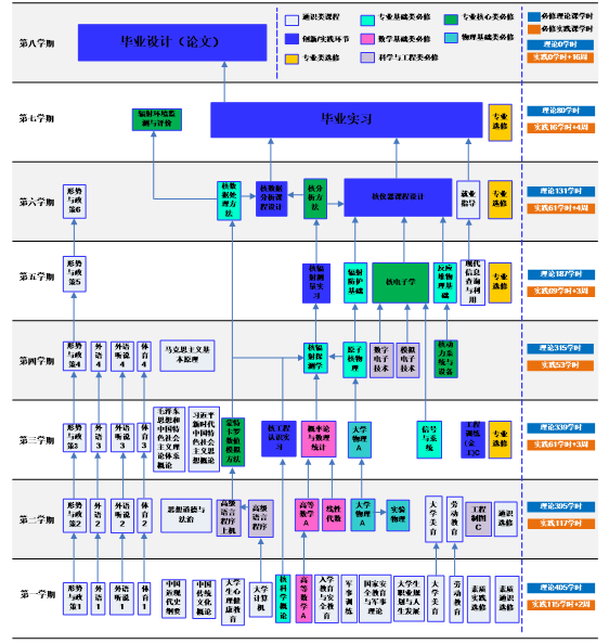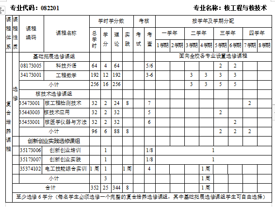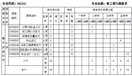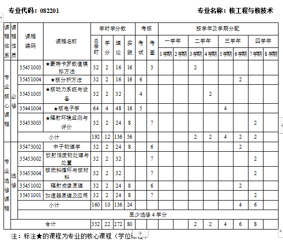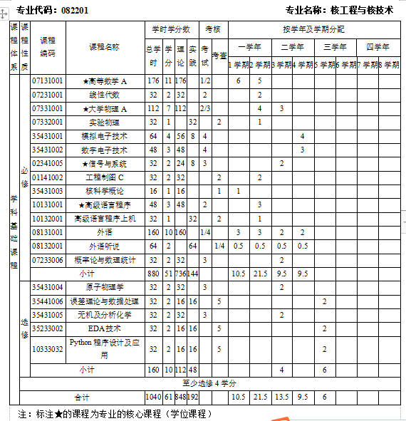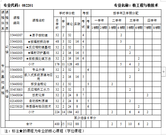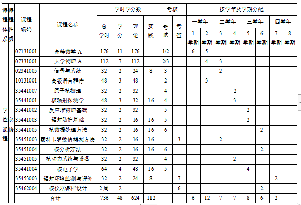 主干课程:高等数学,大学物理,高级语言程序设计,外语,原子核物理,核辐射探测学,反应堆物理基础,辐射防护基础,核电子学,核数据处理方法,蒙特卡罗数值模拟方法,核分析方法,核动力系统与设备,嵌入式系统原理与应用,辐射环境监测与评价,核技术应用等。