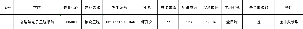 因学校招生计划指标调整,经我院研究生招生复试录取工作组会议研究确定:本院085803核能工程专业按复试合格考生综合成绩依序(已被他校录取考生视作自动放弃)递补拟录取1名考生。名单如下: