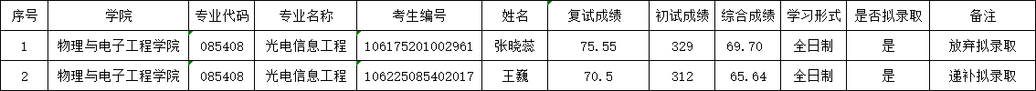 本学院拟录取的(085408光电信息工程)调剂考生因个人原因放弃拟录取资格,经我院研究生招生复试录取工作领导小组会议研究确定:按调剂复试合格考生综合成绩依序(已被他校录取考生视作自动放弃)递补拟录取1名考生。名单如下: