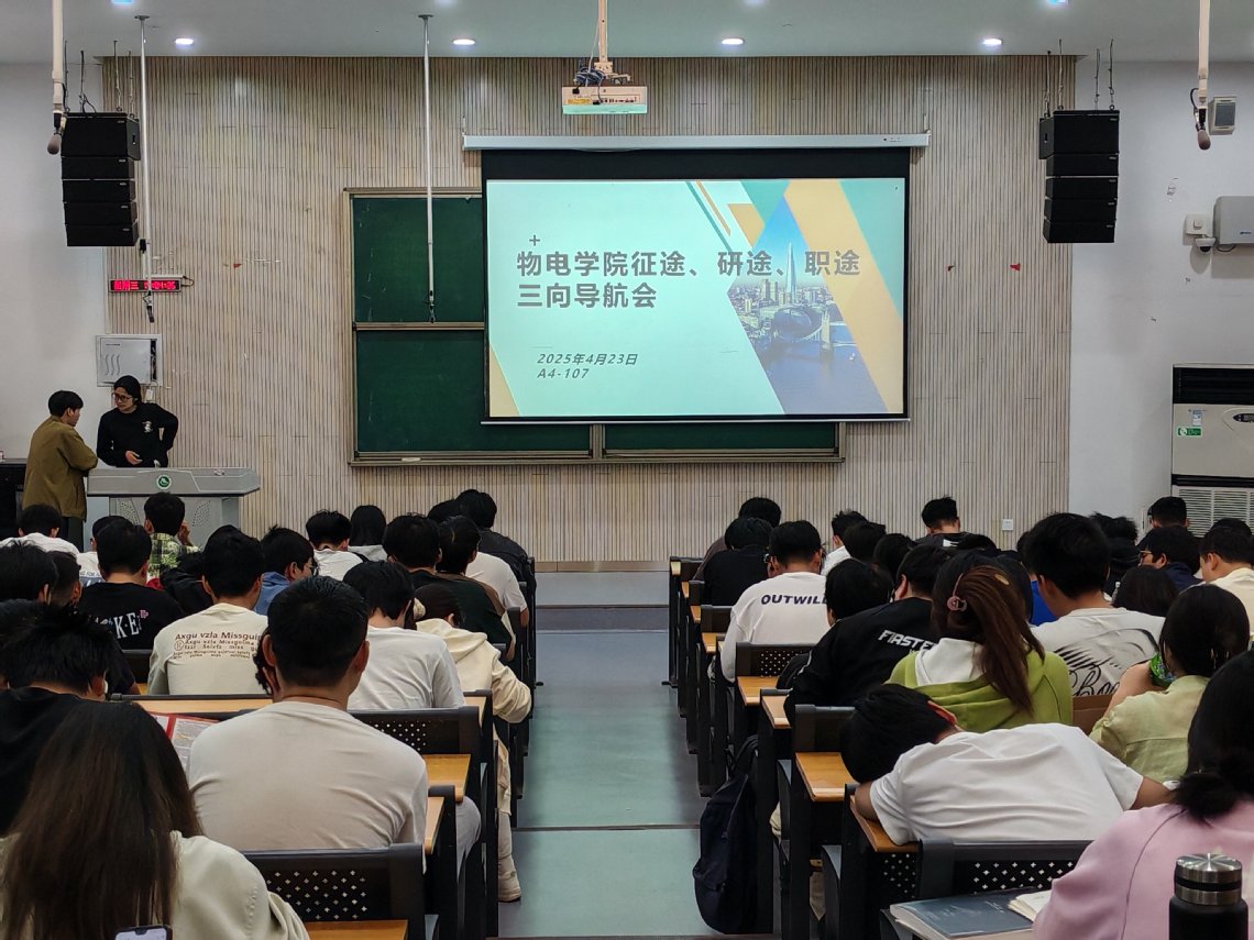 4 月 23 日,物理与电子工程学院于 A4-107 教室举办了一场主题为 “春风送暖,研途领航” 的考研交流会。此次活动邀请到 2021 级成功考取“985 ”高校的三位优秀毕业生吴成杭、符自雨、康桂铭,与2022 级近 200 名学生分享考研经验,交流会由学工办樊小灵老师主持。