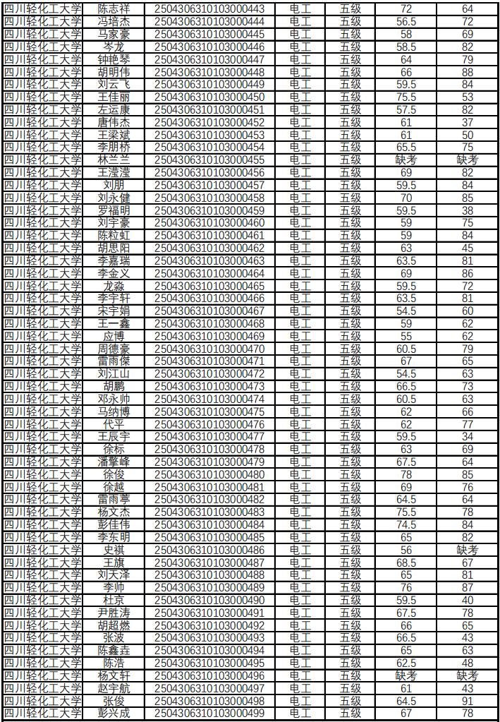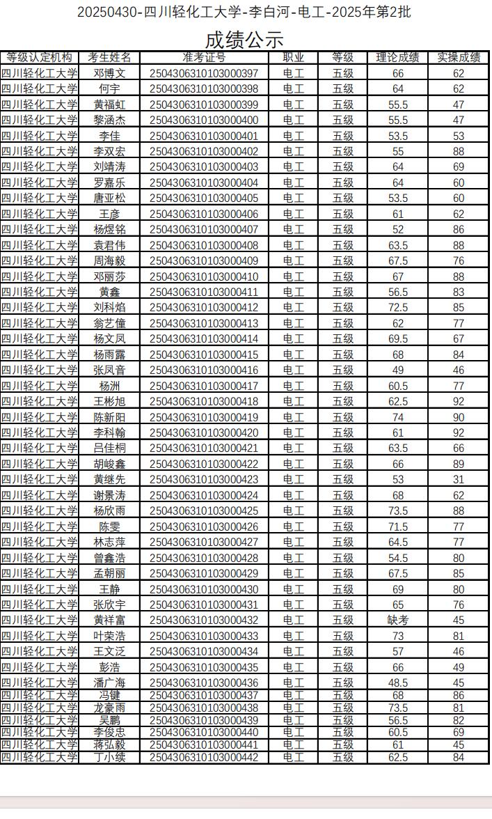 “20250430-四川轻化工大学-李白河-电工-2025年第2批”职业技能等级认定考评工作已经结束,考评小组按照国家职业标准,本着公平、公正原则,对所有考生的作品进行了成绩评定,现通过学院网站予以公示。