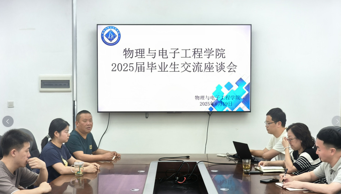 为深入倾听毕业生心声,搭建学院与毕业生沟通的桥梁,凝聚发展共识,助力学子扬帆远航,2025 年 6 月 19 日下午,物理与电子工程学院在宜宾校区 A5-414 会议室成功举办 2025 届毕业生代表座谈会。学院党委副书记车蔓、副院长袁玉全、学工办主任何强、毕业班辅导员安晓军、石明星等教师代表与各专业毕业生代表齐聚一堂,在温馨热烈的氛围中畅叙情谊、共话未来,座谈会由学工办主任何强主持。