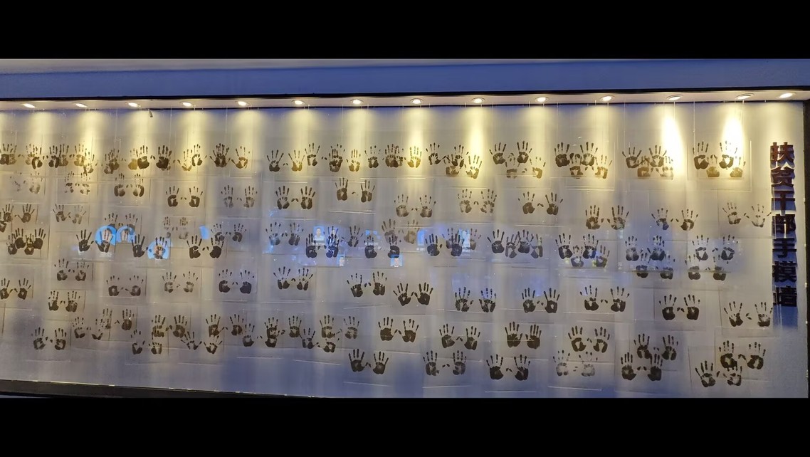 当团队步入“幸福是奋斗出来的”主题展区,一面承载着深刻意义的手模墙赫然呈现,此前积累的情感共鸣在此刻达到顶点。墙上每道手印,都来自扎根彝区的基层人:有手掌磨茧的驻村书记,有走破鞋底的乡镇干部,有奉献青春的志愿者。这些手印是与贫困“死磕”的勋章——暴雨中劝迁危房群众、田间地头试验产业、用“彝汉双语”解读政策,每道掌纹都刻着奋斗故事。身旁的扶贫干部姓名墙与之呼应,名字与手印拼成彝区脱贫的“奋斗群像”,让成员们真切触摸到“基层力量”的重量。
