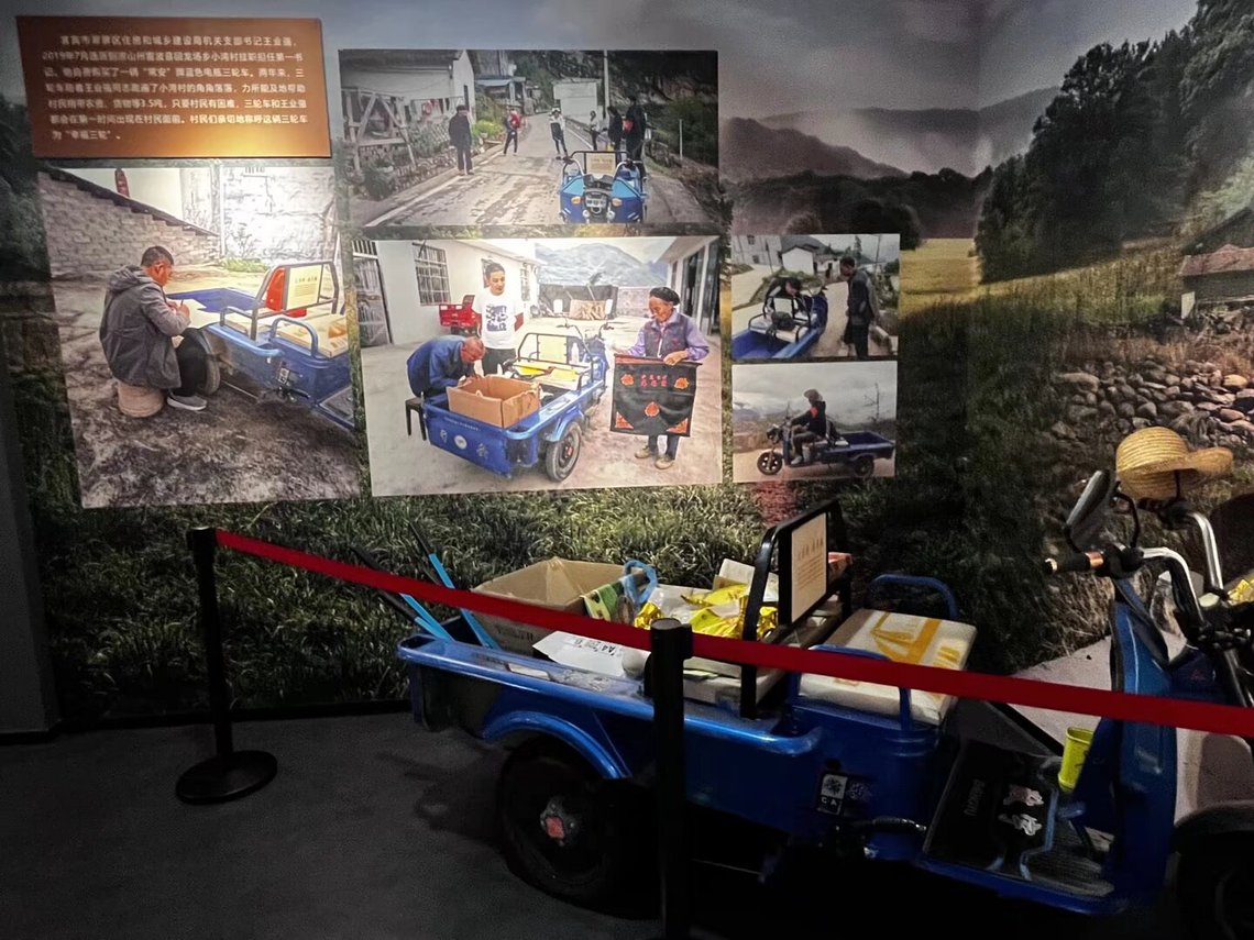 随后,“全面小康路上一个都不能少”展区展开精准帮扶画卷。在“对口帮扶”板块,琳琅满目的展品诉说着帮扶故事,其中“幸福三轮车”展品尤为特别。团队成员与该项目的帮扶人王业强皆来自宜宾市翠屏区,这份同乡情谊,让这辆承载着帮扶成果与希望的三轮车格外牵动团队的心。正是无数像这样跨区域的基层干部,将“工业强” 思路带到彝区,让“幸福三轮车”成为群众增收的“助力器”,更见证全省多地共赴凉山脱贫的广泛格局。展区内《金不换银不换》的旋律响起,歌声里既有群众对幸福生活的珍视,更藏着基层干部与群众的共筑默契。