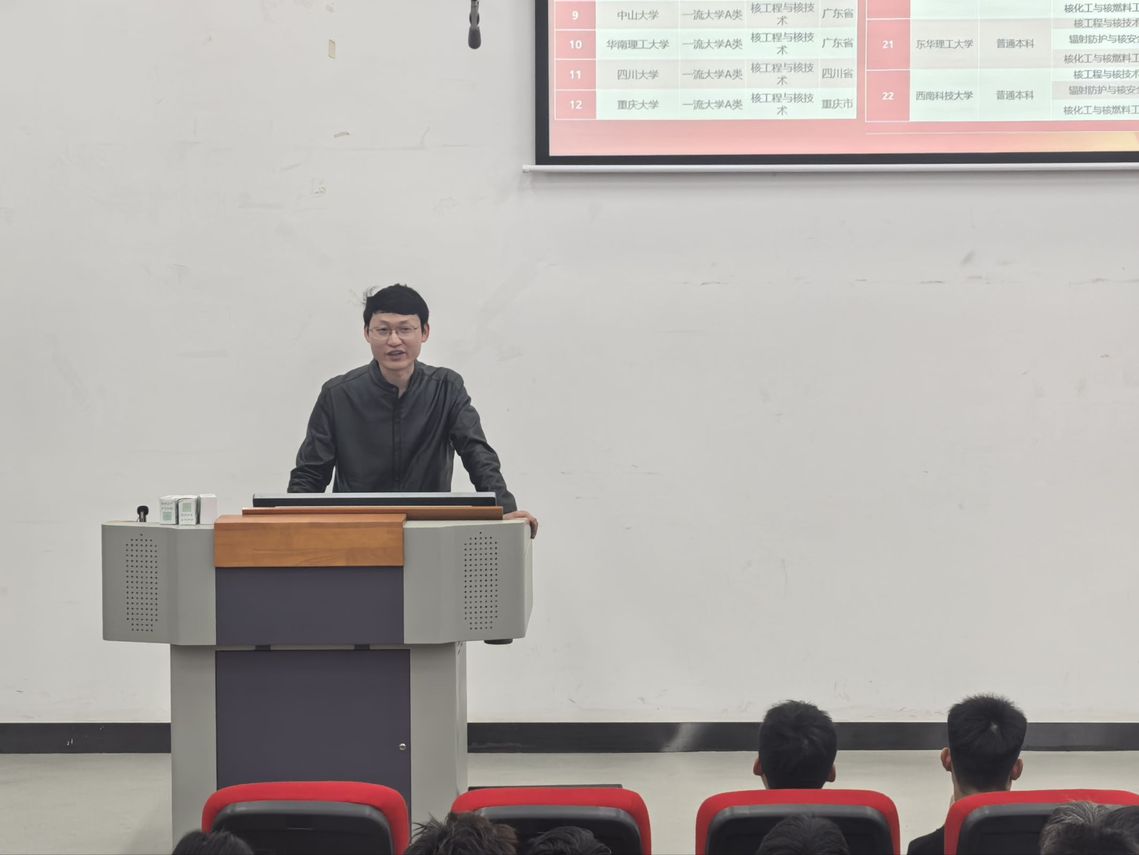 刘永春副院长分别从学科发展前景、考研专业选择的战略意义、学术能力培养核心方法等维度,结合行业发展趋势与人才培养目标,进行了分享。辅导员石明星老师围绕我校研究生国家奖助学金政策,展开了深度解读,为学子们的深造之路注入“政策底气”。魏世平老师、鄢刚老师立足物理与核工程领域的行业需求,从考研重难点拆解、就业岗位分析等专业视角提出针对性建议,围绕备考心态调整、职业规划逻辑构建等内容,为学子们提供了全方位的成长指导,用丰富的经验为学生拨开迷雾。
