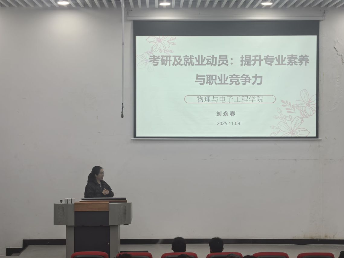 11月9日,物理与电子工程学院于LA5-104教室举办了2025年考研暨就业动员交流会。学院副院长刘永春、专业骨干教师、学工办老师及学生代表齐聚一堂,为学子们送上“成长指南”。