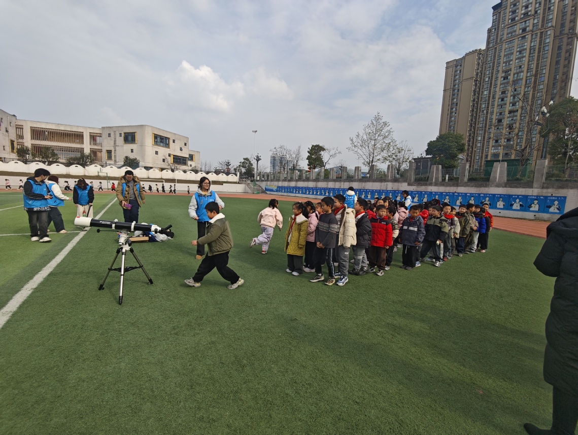 活动前,志愿者结合我院专业特色,精心筹备课程内容,通过授课的形式,为孩子们讲解宇宙起源、星系构成及太阳系相关知识。在趣味体验环节,志愿者全程陪同指导孩子们触摸静电球,观测望远镜,参与水火箭发射实践,引导孩子们深切体会物理的独特魅力。