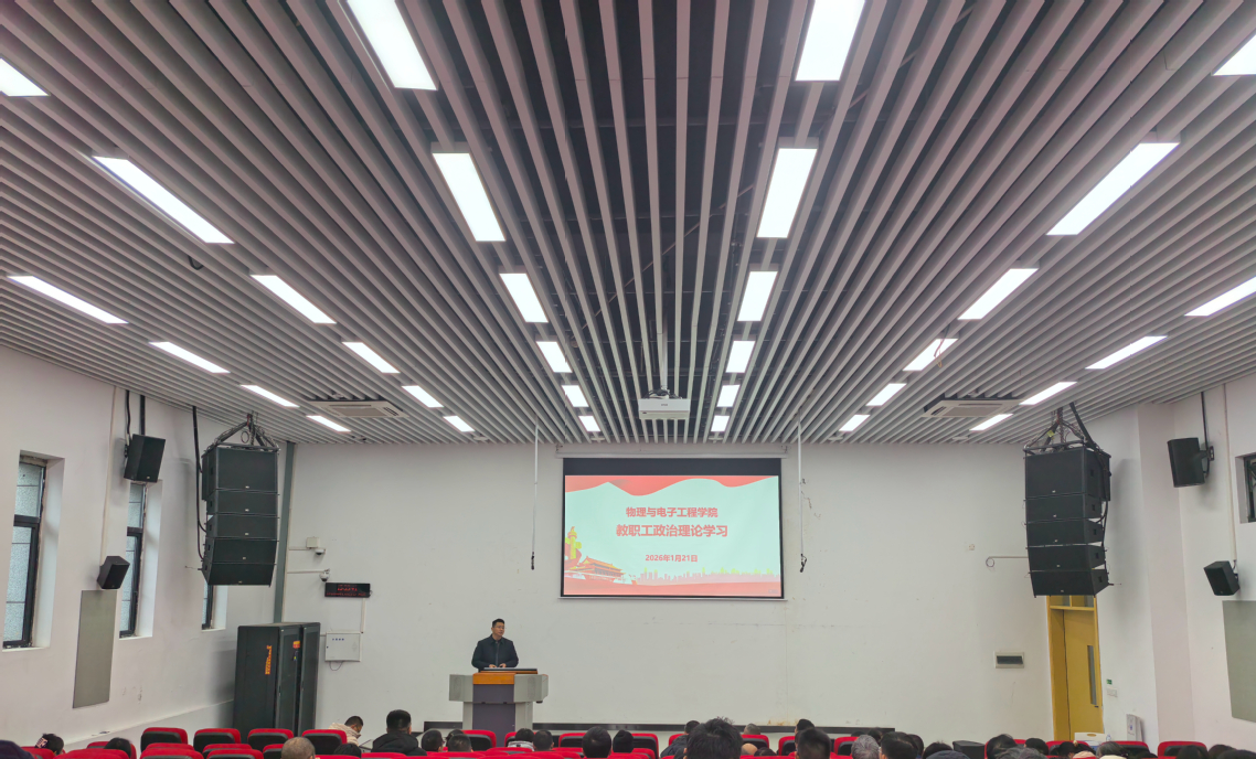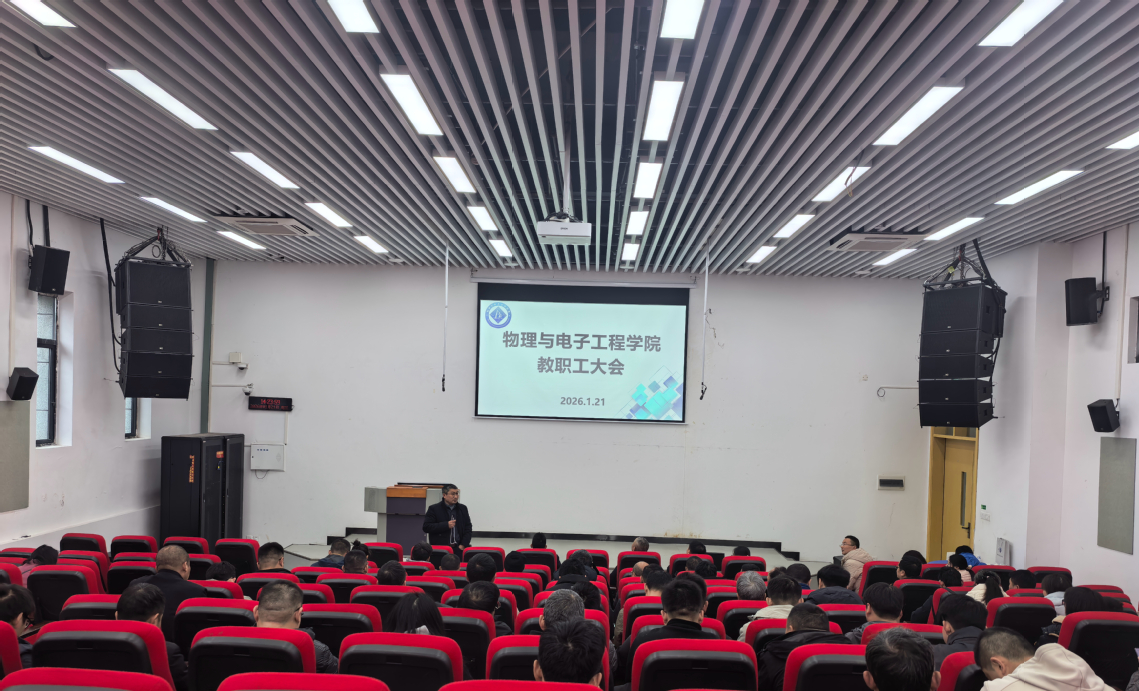 1月21日,物理与电子工程学院召开教职工大会,全面总结2025年度各项工作,安排部署寒假期间重点任务,并展望2026年学院发展愿景。会议由学院院长杨剑波主持,学院全体教职工参加。