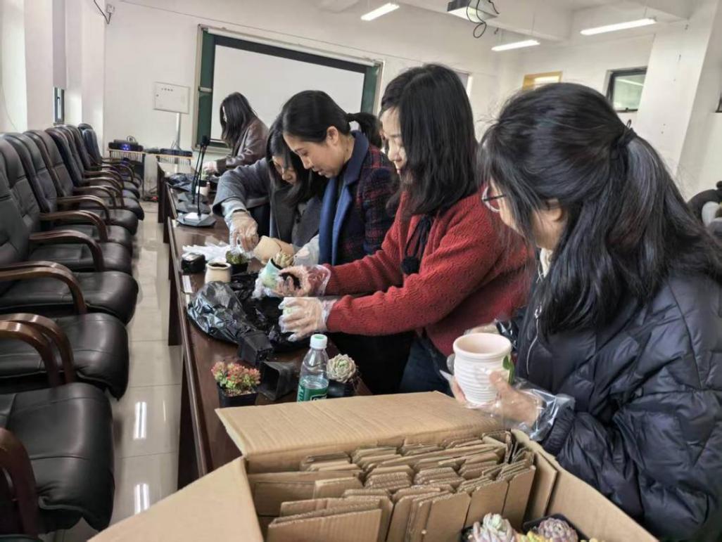 在交流环节,老师们畅所欲言,分享工作心得与生活感悟,现场气氛轻松融洽,欢声笑语此起彼伏。学院分工会精心筹备了形态各异、憨态可掬的多肉植物,还有精美的花盆、营养土和装饰配件的“多肉盆栽DIY”环节,将活动推向了高潮。
