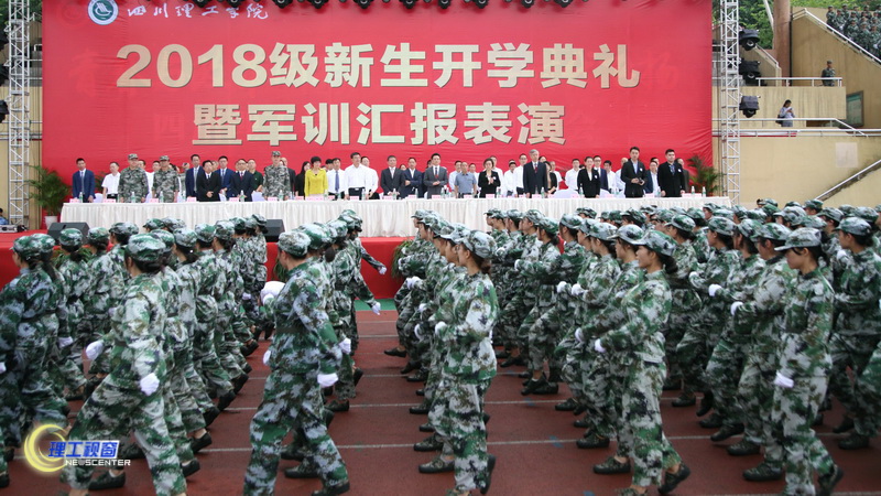 9月14日上午, 2018级新生开学典礼暨军训汇报表演在汇南运动场隆重举行。自贡市委副书记李国贵,自贡军分区副司令刘新宇大校,自贡军分区战备建设处处长罗军上校;自流井区人民武装部部长、军训旅旅长汪鲲上校;泰国乌汶府教育代表团庄云霓一行;校党政领导王洪辉、庹先国、龚敏、刘康、肖兴政、颜杰、高小林,学校各职能部门、二级学院负责人出席大会并在主席台就坐。党委副书记龚敏主持大会。