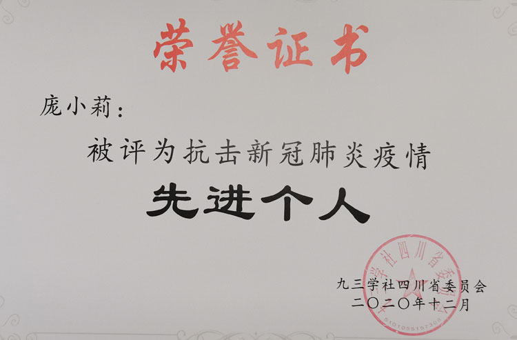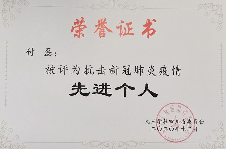 付磊、庞小莉获九三学社四川省委抗击新冠肺疫情先进个人荣誉称号