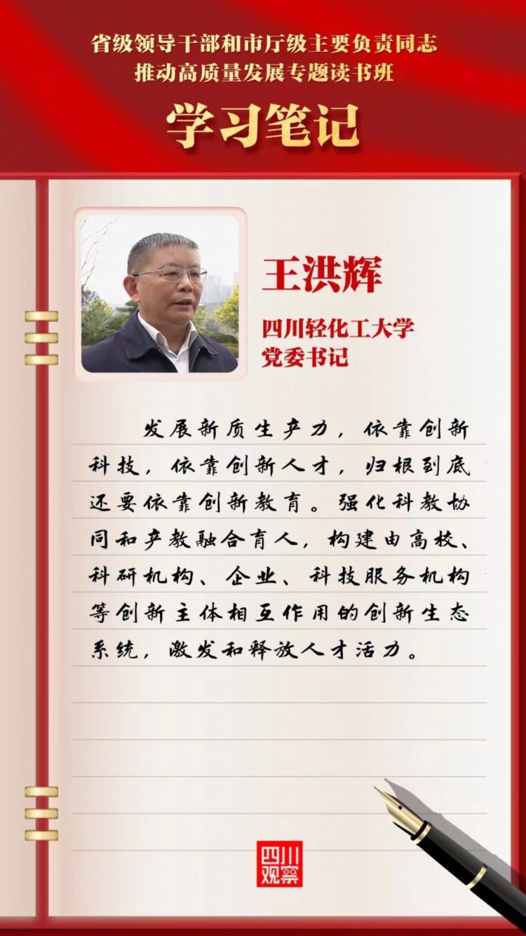 2月25日至28日,四川省级领导干部和市厅级主要负责同志推动高质量发展专题读书班在成都举行。龙年新春,集中充电,这一场为期四天的“开春第一课”让校党委书记王洪辉收获颇丰、感悟深刻,对高质量发展尤其是加快发展新质生产力有了进一步认识和体会。