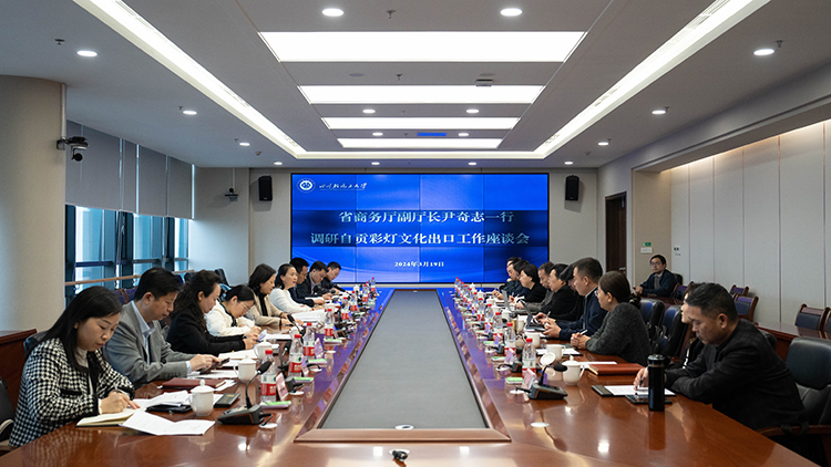 3月19日下午,省商务厅副厅长尹奇志一行莅临学校李白河校区调研自贡彩灯文化出口工作,并在行政中心911会议室召开座谈会。学校党委常委、副校长、中国彩灯学院院长高小林,省商务厅服贸处处长熊金华,省商务厅服贸处工作人员张正,市商务局局长秦川,美术学院院长黄磊和市委宣传部、市文旅局、市文旅投、彩灯学院等单位相关人员参加座谈会,市政府副秘书长韦媛媛主持座谈会。
