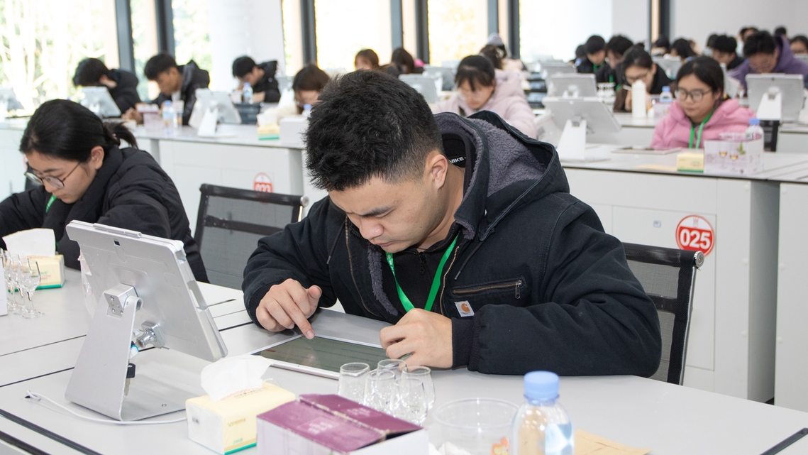 品酒赛场上,选手们将自己的专业知识与实践能力相结合,展示了扎实的基本功以及良好的专业素养。喻康杰是来自西北农林科技大学的遗传学育种的博一的学生,在品酒大赛中,他秉承着“鼻闻其香,口尝其味”的原则体会酒液醇香。他表示,品酒需要注意许多细节,不仅需要具备丰富的理论知识,还要保持良好的心态,保证规律的作息时间。感官,味觉,嗅觉等都会影响对酒的品鉴。
