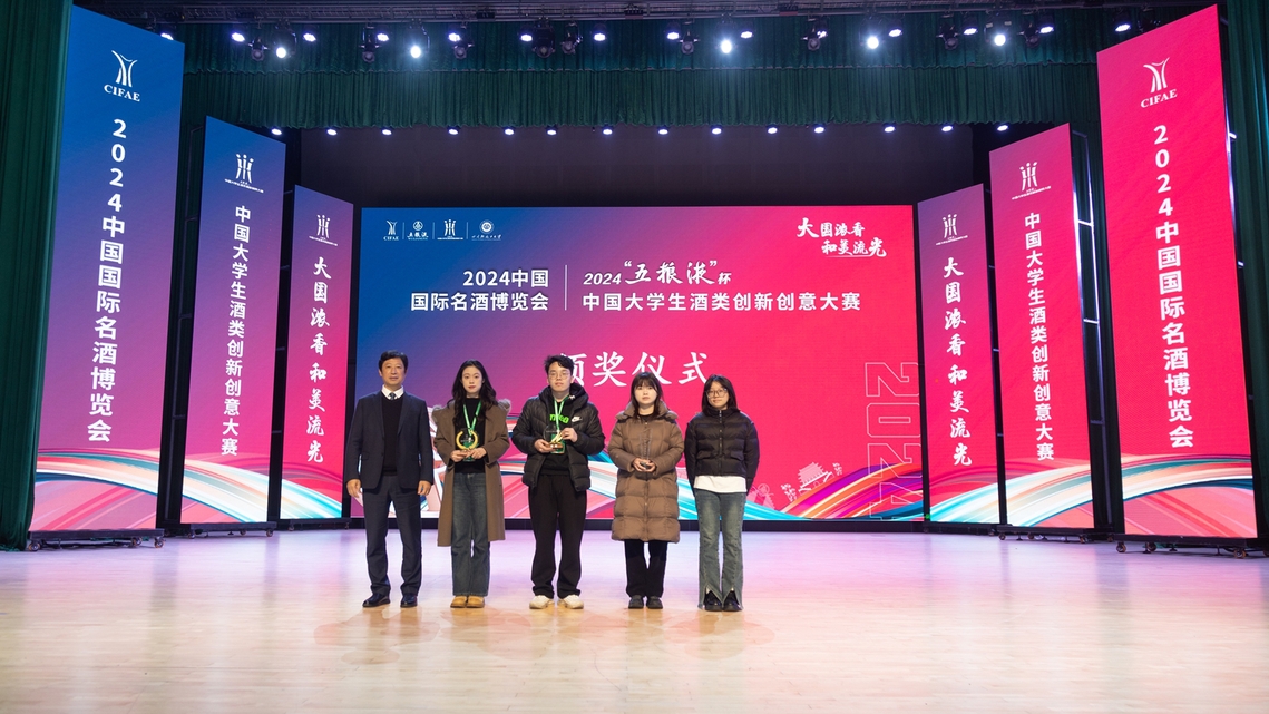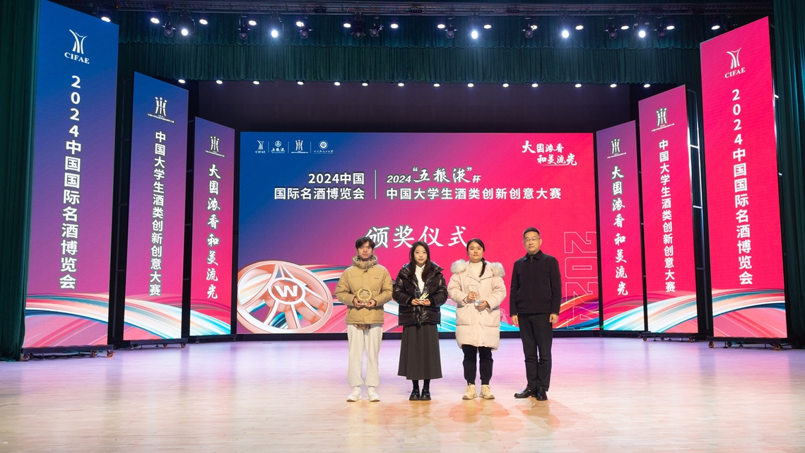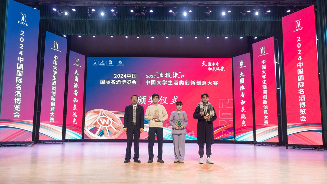 经过两天激烈的角逐,我校的参赛作品《2026世界杯冠军纪念酒》《龙舞端阳》《和贤》包揽了2024“五粮液杯”中国大学生酒类创新创意大赛包装营销创意比赛的前三名;酒类创新比赛我校参赛作品《粮心慧检》荣获第一名,成都职业技术学院作品《疆守》获得第二名,上海交通大学作品《解构纤维,糖生万物——酒糟生物质资源综合利用与绿色生物制造》获得第三名;品酒比赛第一名由四川工商职业技术学院的卢丹获得,我校学子黄李娅、郭又铭分获二、三名。