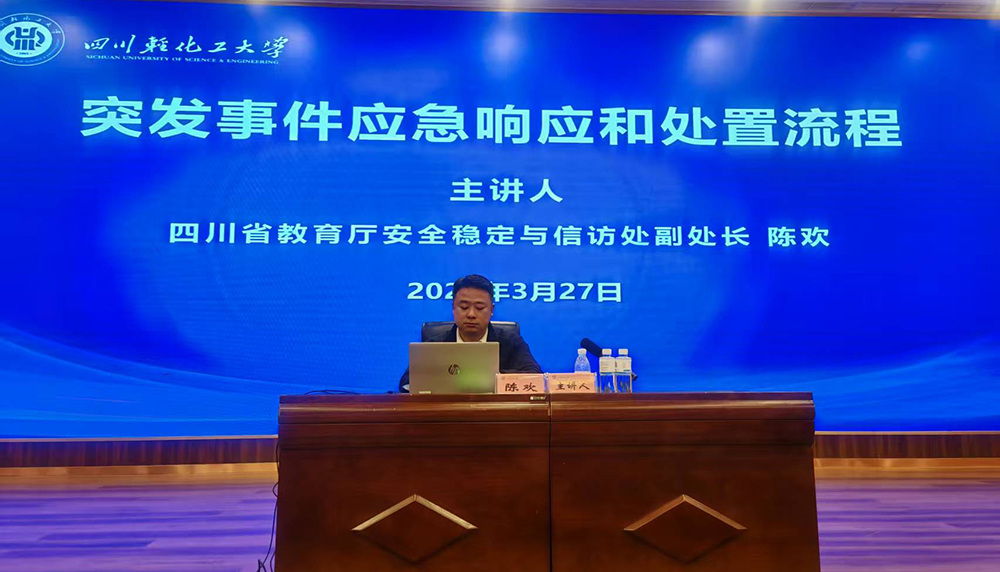 3月27日上午,我校在李白河校区学术报告厅举行辅导员应急处置专题培训。四川省教育厅安全稳定与信访处副处长陈欢应邀出席,并作题为“突发事件应急响应和处置流程”的专题辅导。学校党委常委、副校长吴亚东主持培训,相关职能部门负责人及全体辅导员参加学习。