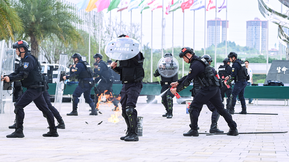 活动在庄严的升旗仪式中拉开帷幕。吴亚东宣布活动启动,魏家鲜宣布反恐防暴应急演练开始。演练环节中,自贡市公安局反恐特警支队先后展示了“五人防暴队形叠加处置战术”和“刀斧砍杀、车辆冲撞等极端暴力案事件联合处置”科目,特警队员动作迅捷、配合默契,现场师生深感震撼、深受教育。演练全面展现了公安队伍应对突发暴恐事件的高效处置能力。