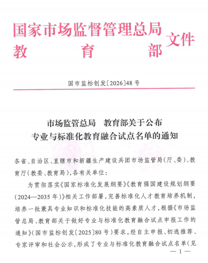 我校成功入选全国首批“专业与标准化教育融合试点单位”